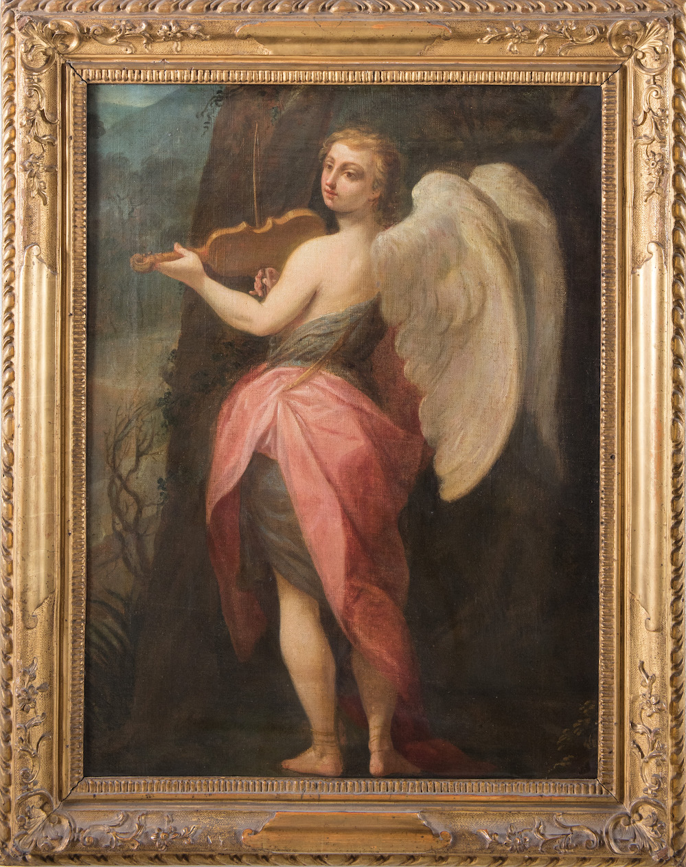 Maestro del XVII secolo. "Angelo musicante". Olio su tela. Cm 75x56,7.
