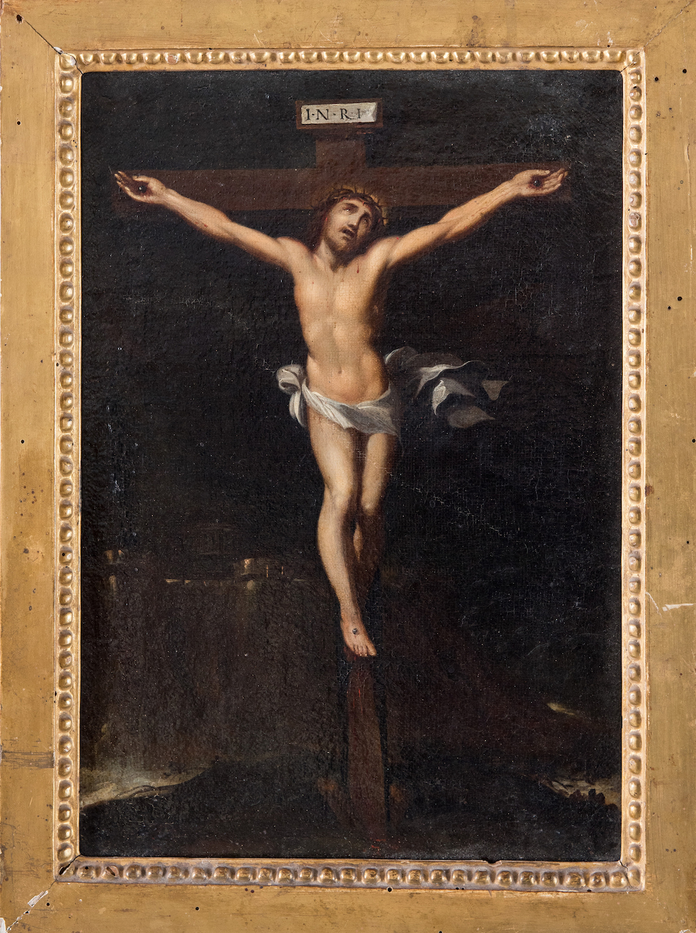 Maestro nordico del XVII secolo. "Crocifissione". Olio su tela. Cm 34x23,5.