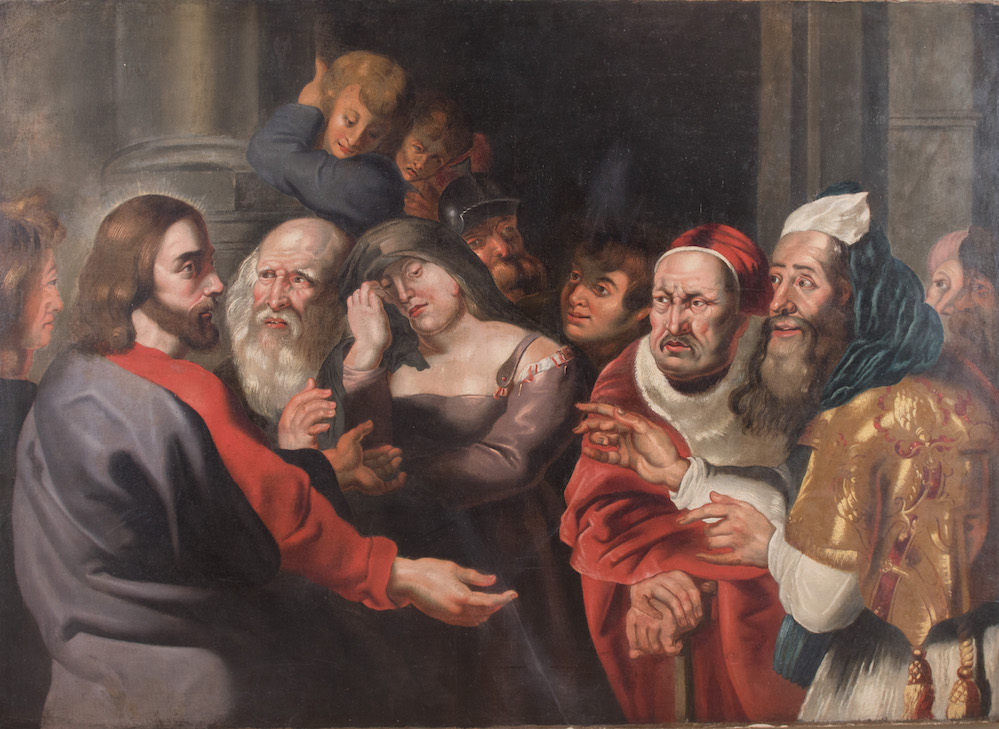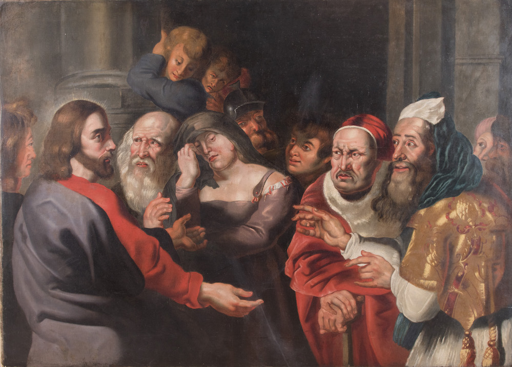 Maestro fiammingo del XVII secolo. "Gesù tra i dottori del tempio". Olio su tela. Cm 113x158.