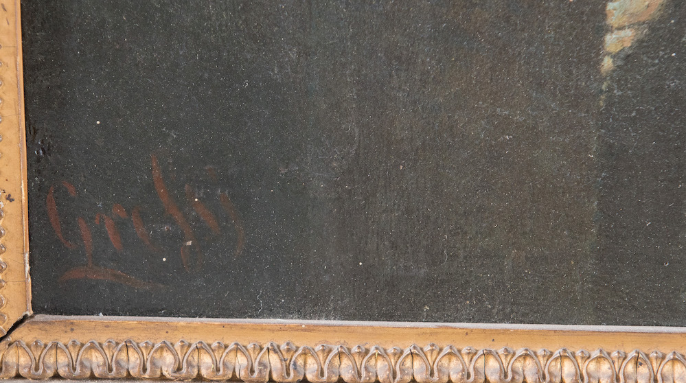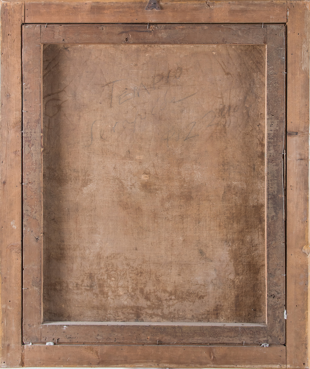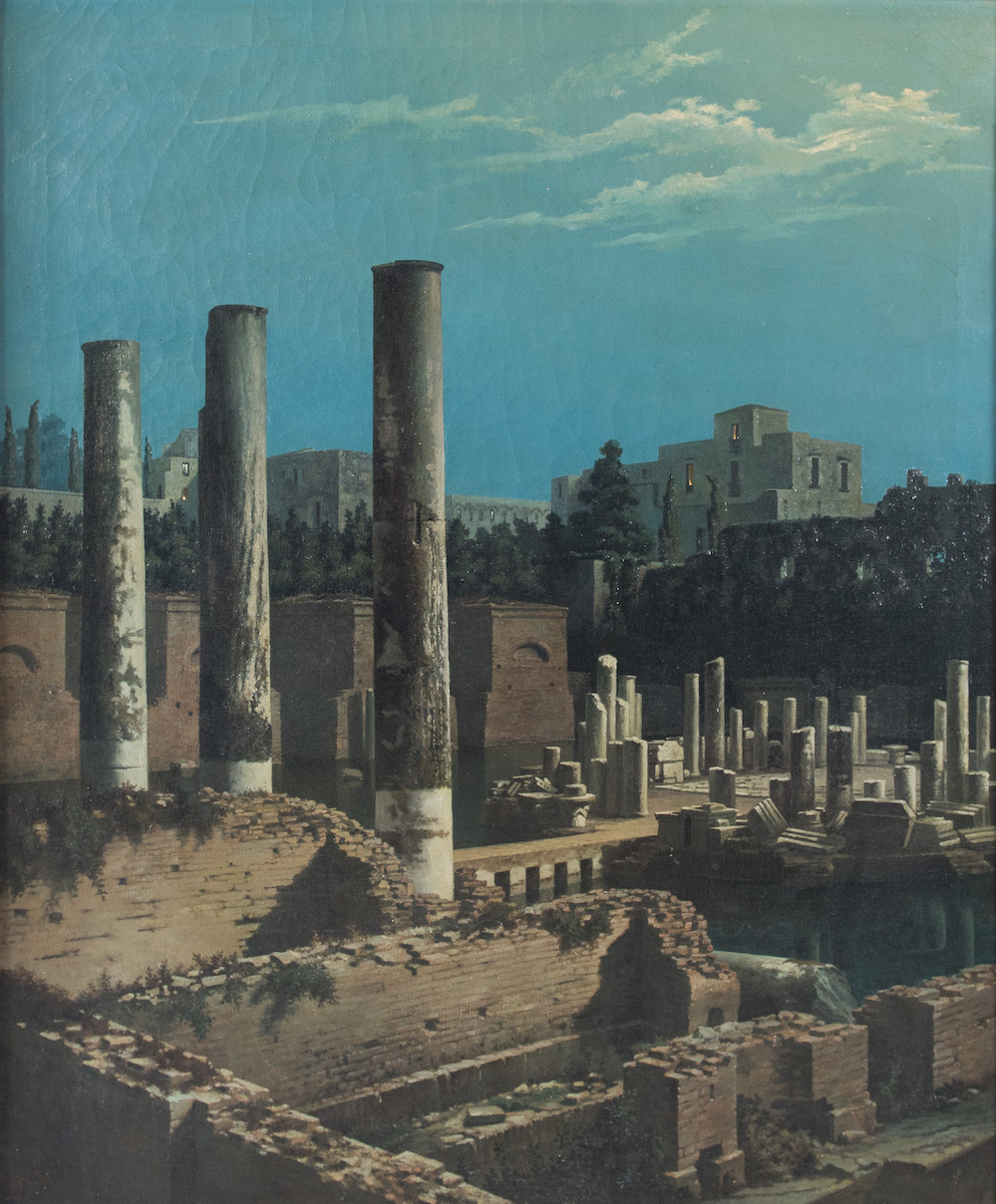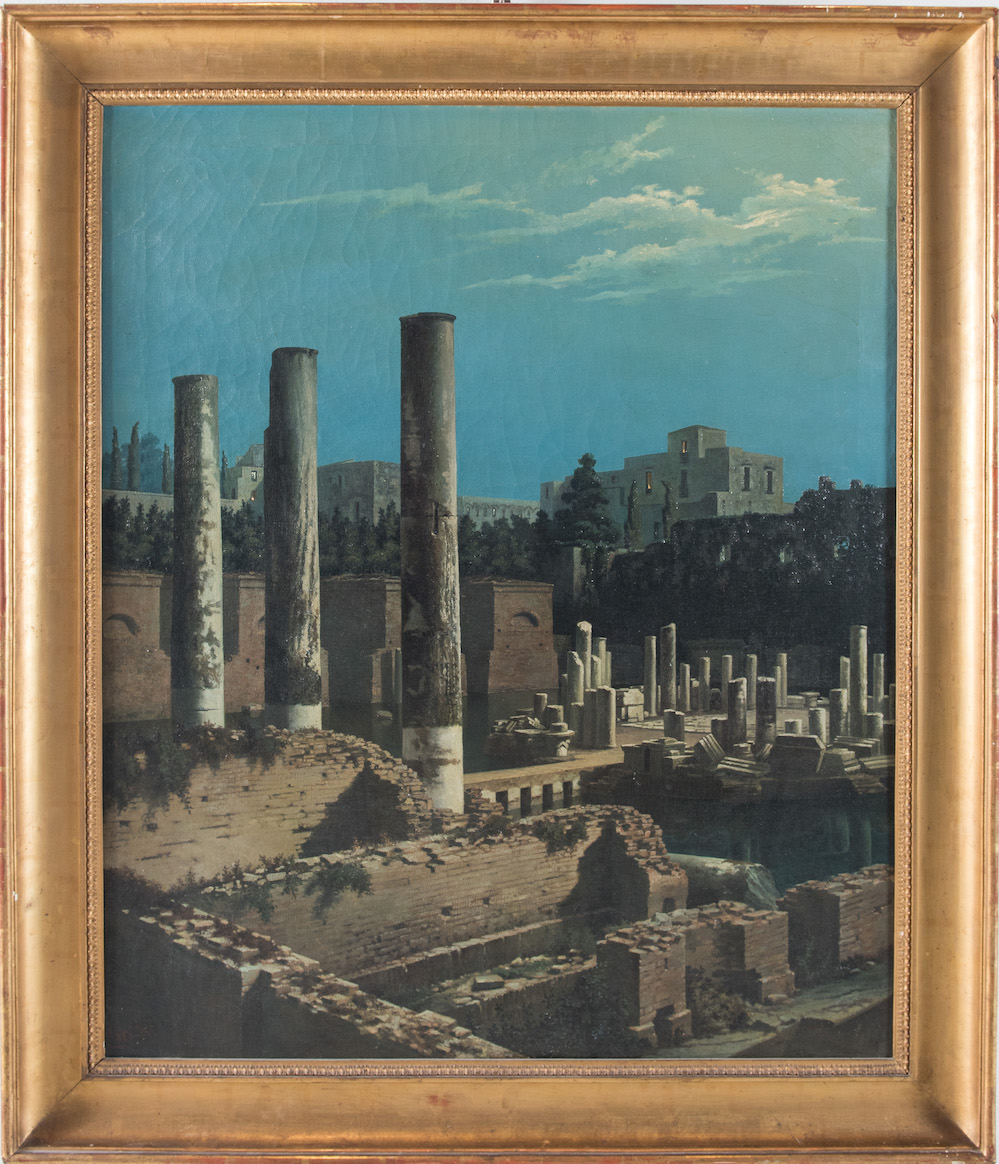 Pittore anonimo della fine del XIX secolo - inizi del XX secolo "Tempio di Serapide a Pozzuoli". Olio su tela. Cm 95x79. Opera firmata in basso a sinsitra con firma indecifrata.