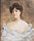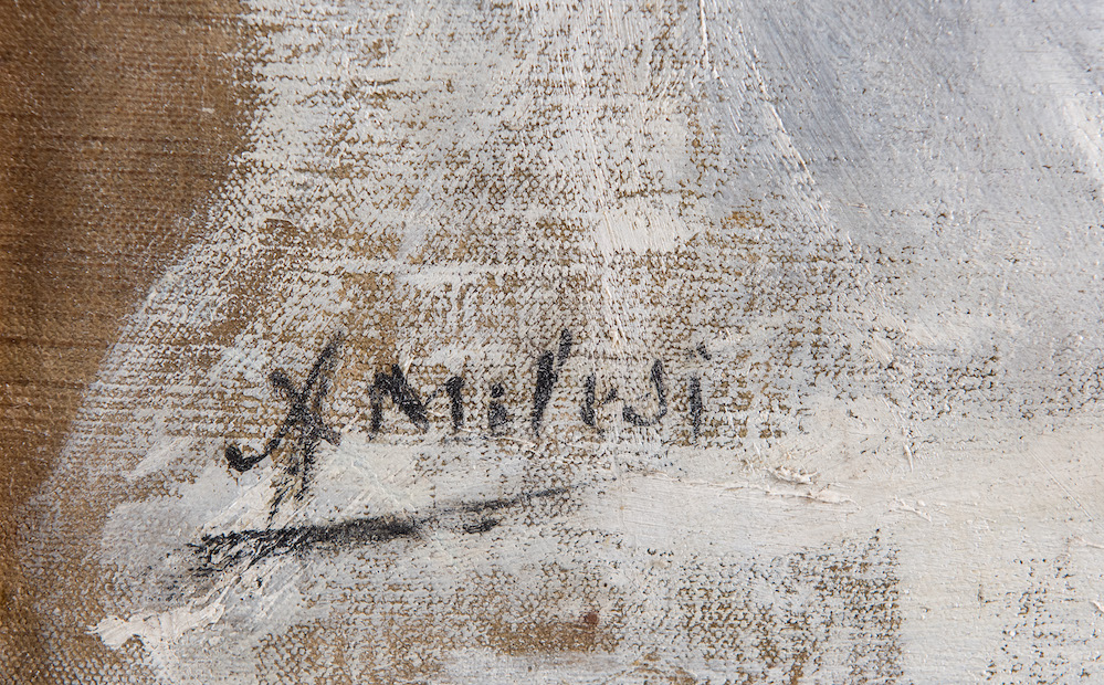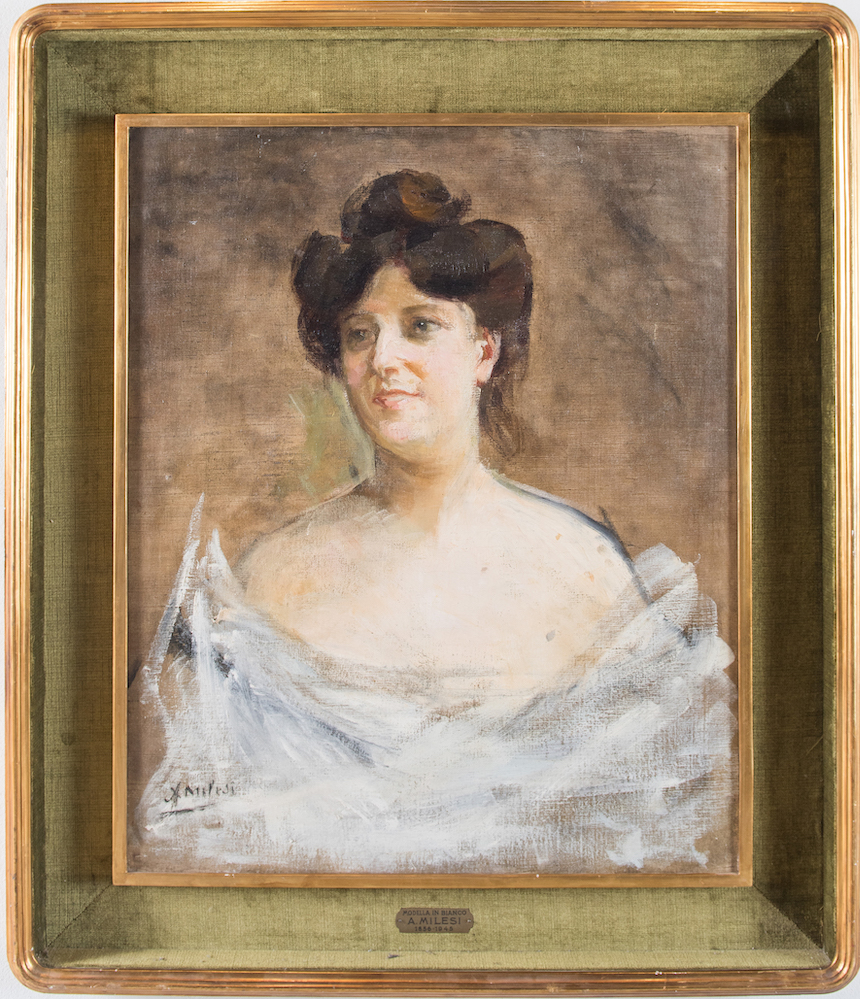 ALESSANDRO MILESI (Venezia 1856 - 1945) "La modella in bianco", 1914. Olio su tela. Cm 80x65. Opera firmata in basso a sinistra A. Milesi. Al retro reca etichetta della terza mostra Artisti Scomparsi, 1913 - 1963, U.I.V.A., Milano, via Marciano 6. Reca etichetta della quarta mostra Artisti Scomparsi 14 - 31 Maggio 1964, Verona, Palazzo Gran Guardia. Al retro reca autentica della figlia Antonietta Milesi in data 1981. Provenienza: importante collezione privata, Bologna.