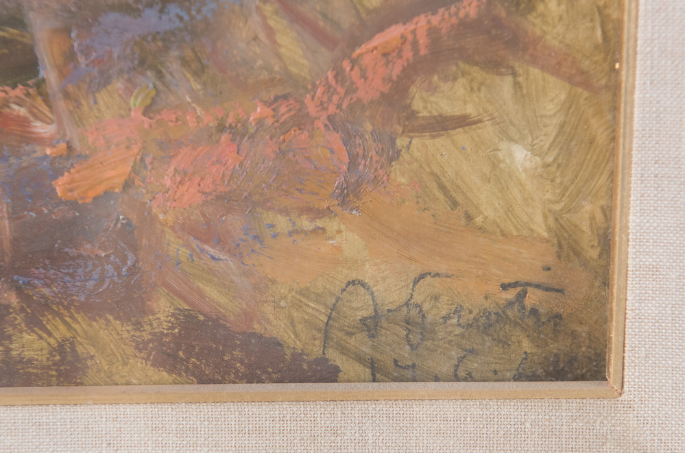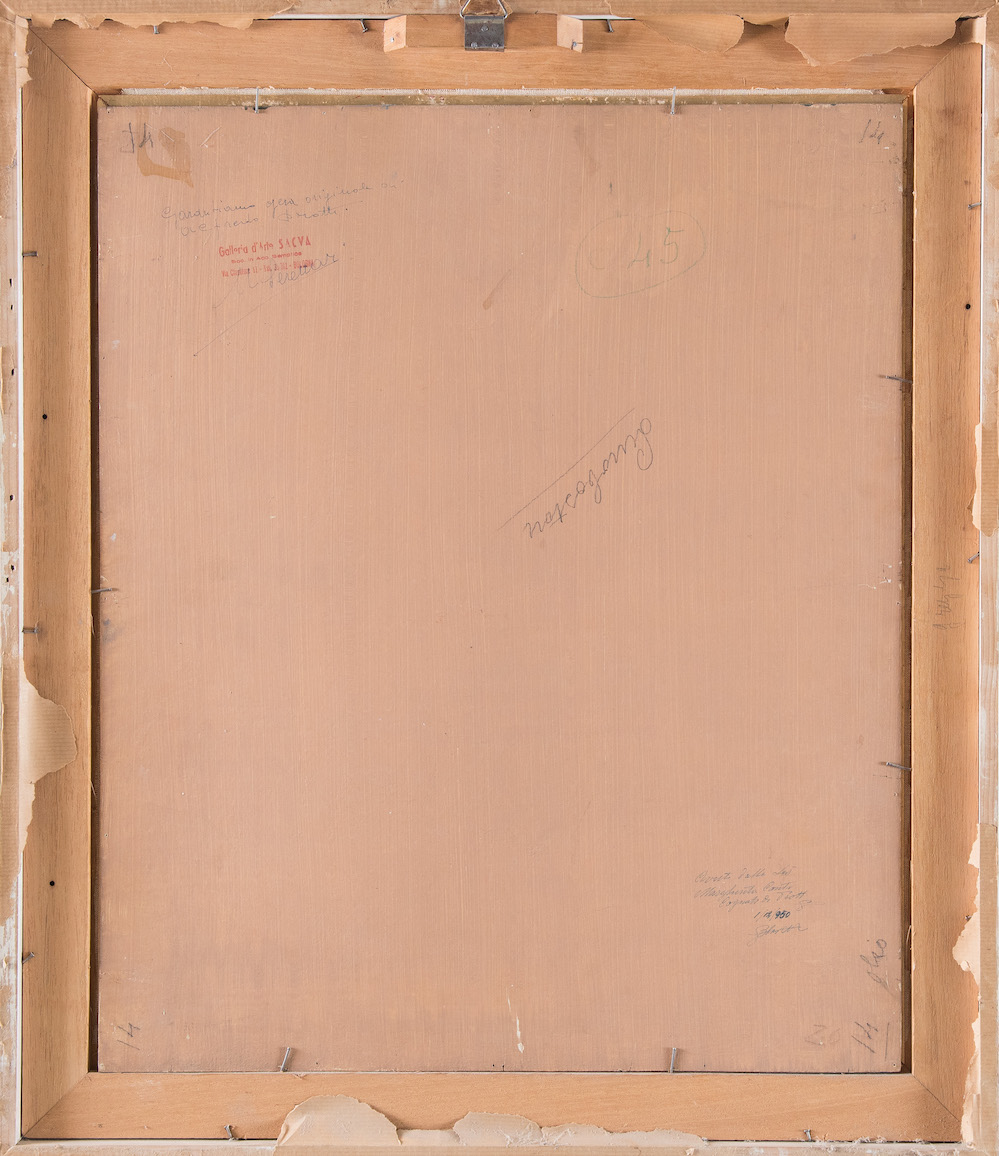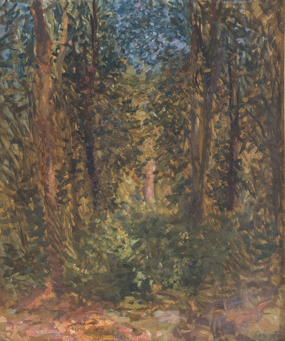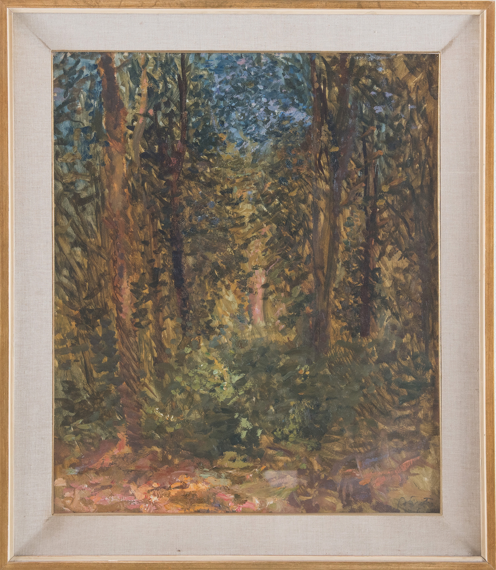 ALFREDO PROTTI (Bologna 1882-1949) "Bosco", 1947. Olio su tavola. Cm 61,5x50. Opera firmata e datata in basso a destra A. Protti 1947. Al retro reca timbro della Galleria D'Arte Sacva, Bologna. Provenienza: importante collezione privata, Bologna.