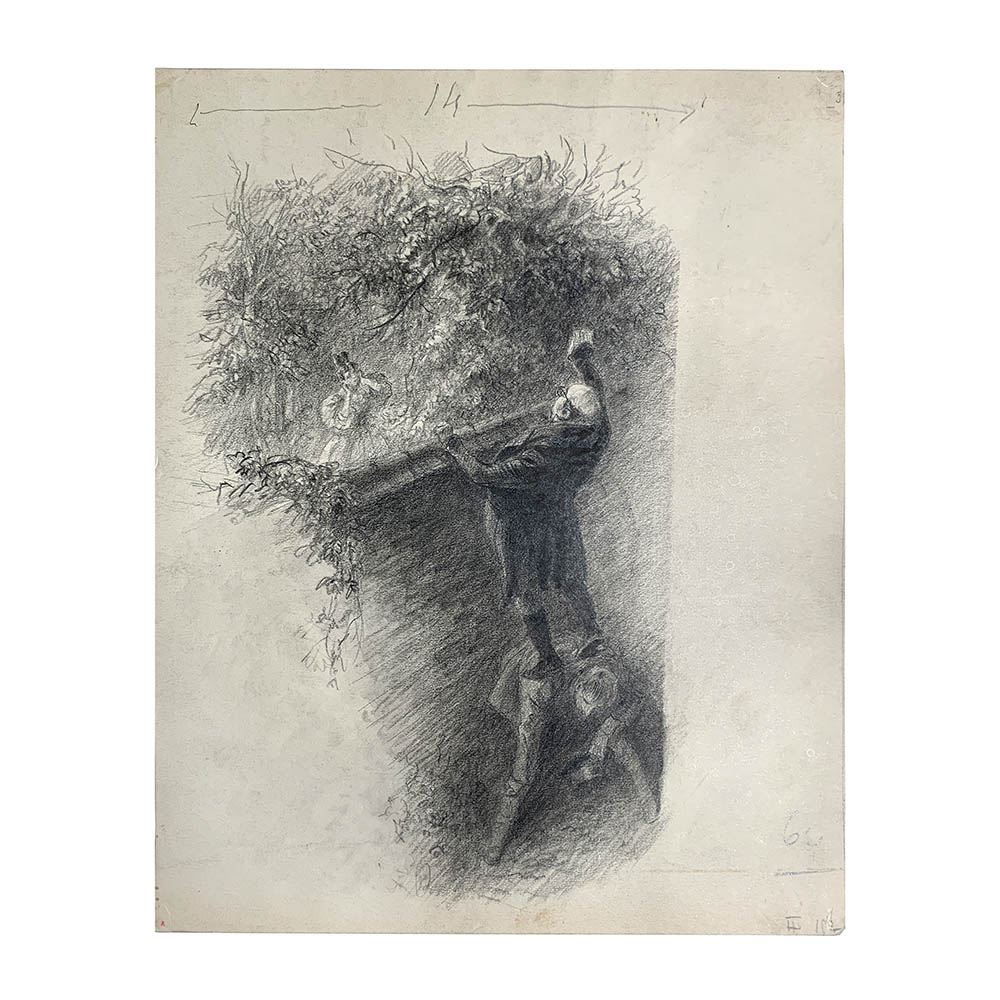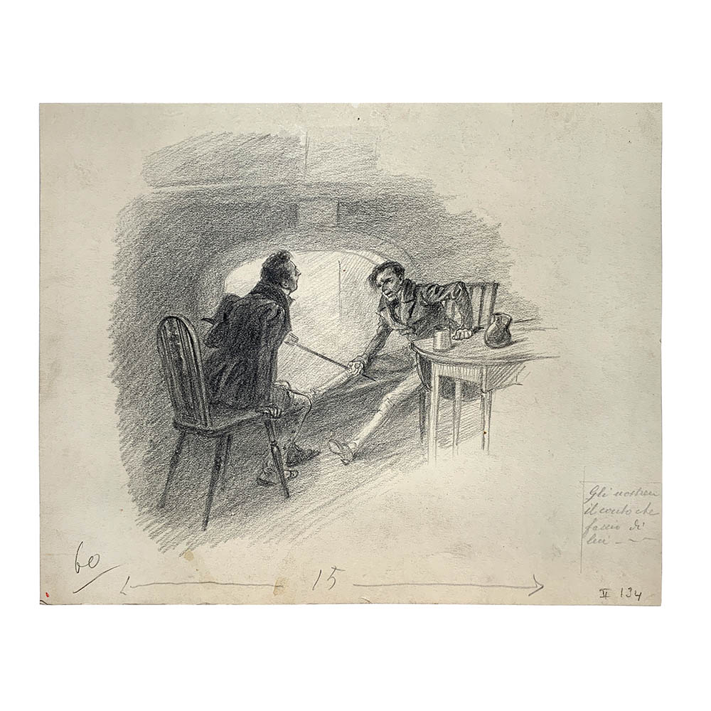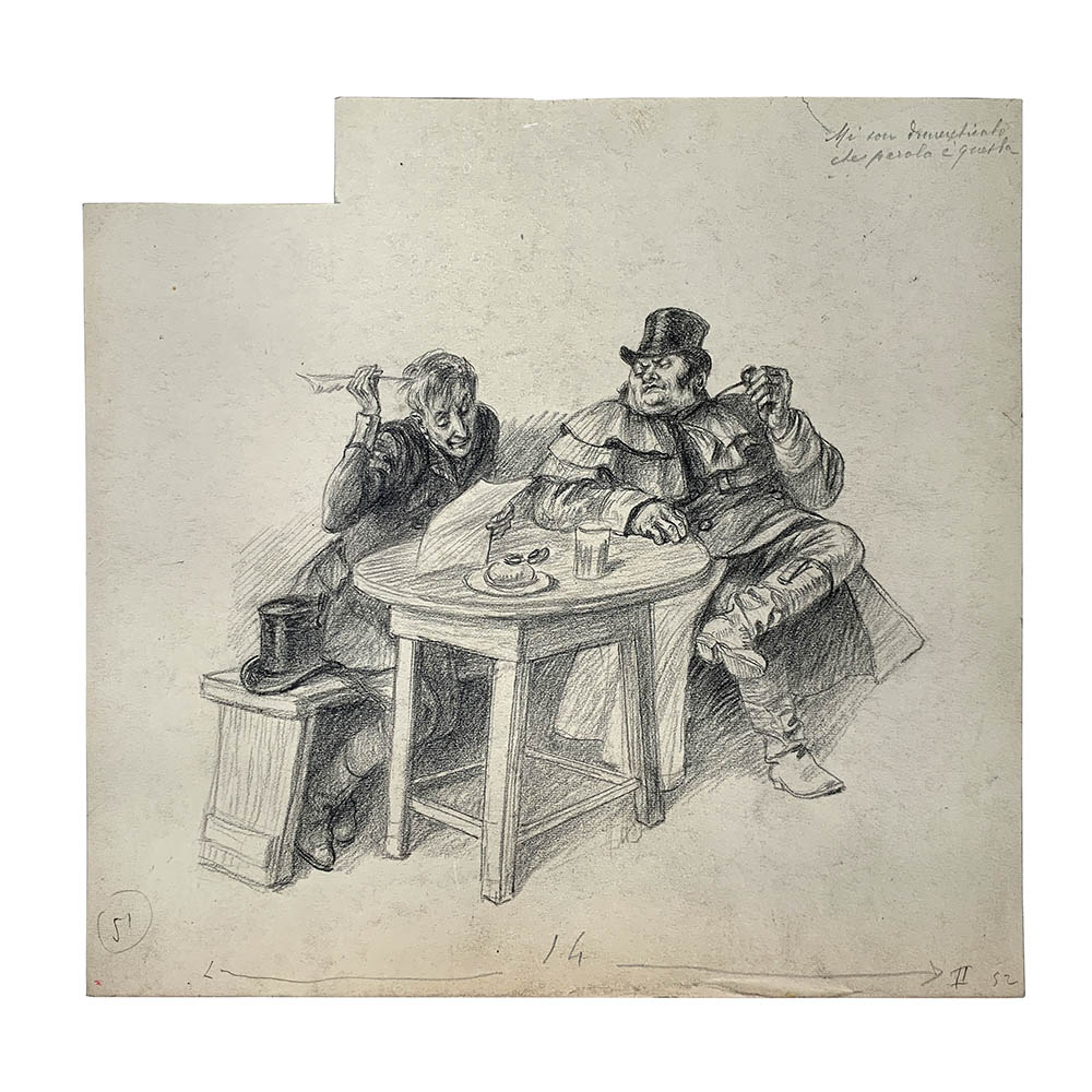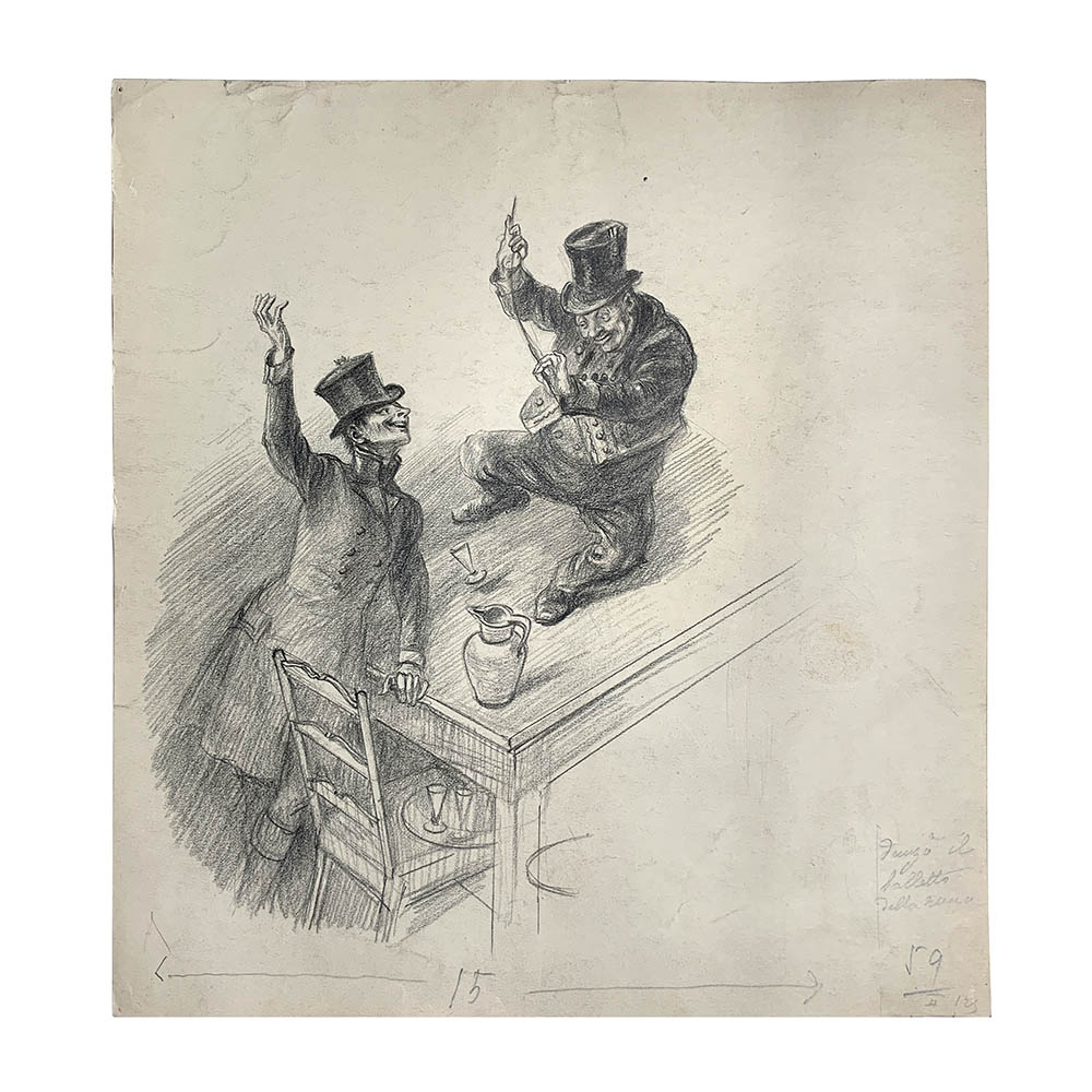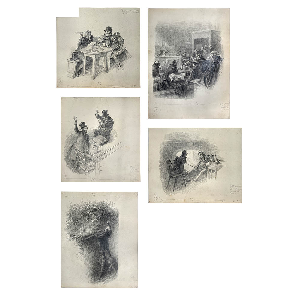 Lotto composto da n. 5 disegni, matita su carta, per “Gli annali postumi del circolo Pickwick, Rizzoli, 1946”. Dimensioni: