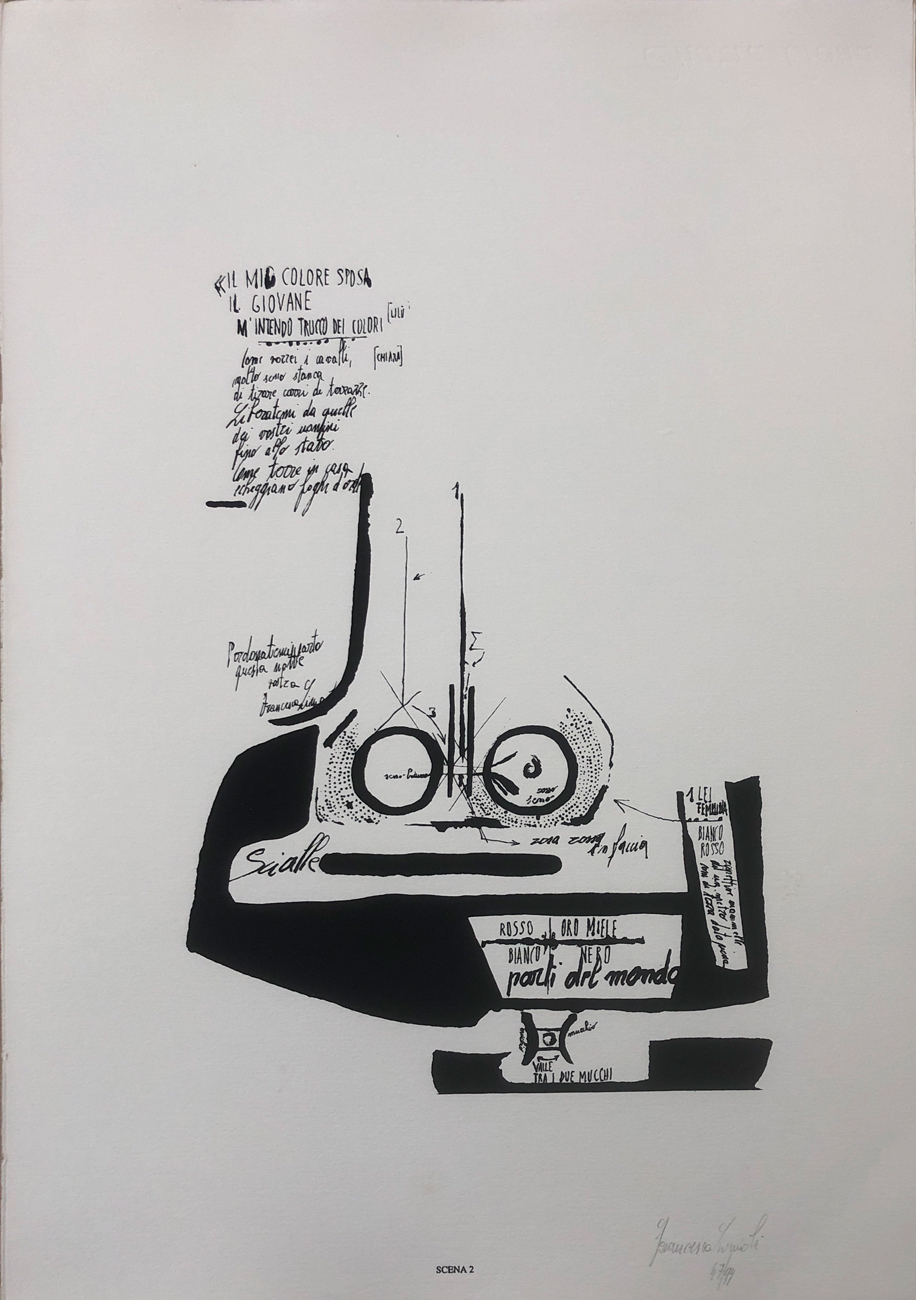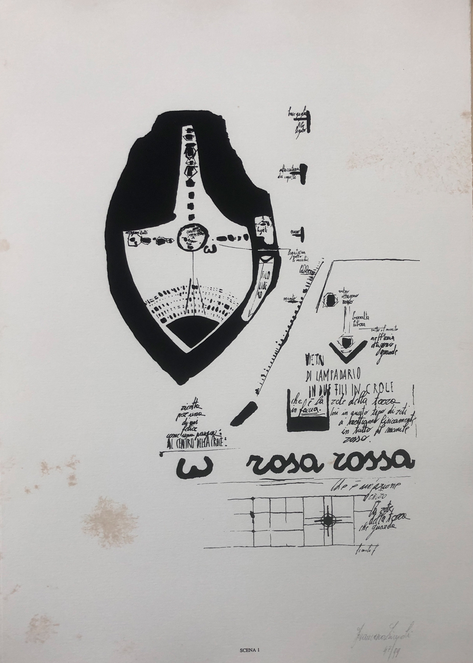 Edizione contenente testi dell’opera teatrale ‘La rosa d’oro’ suddivisa in 6 scene, 4 litografie di Francesca Limoli recanti firma e numerazione (Esemplari 47/99) a matita al fronte, una