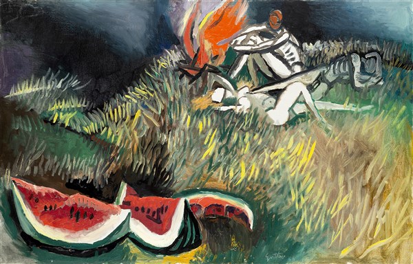 Renato Guttuso "Gita notturna (Anguria su paesaggio)" 1966 olio su tela cm 47,5x