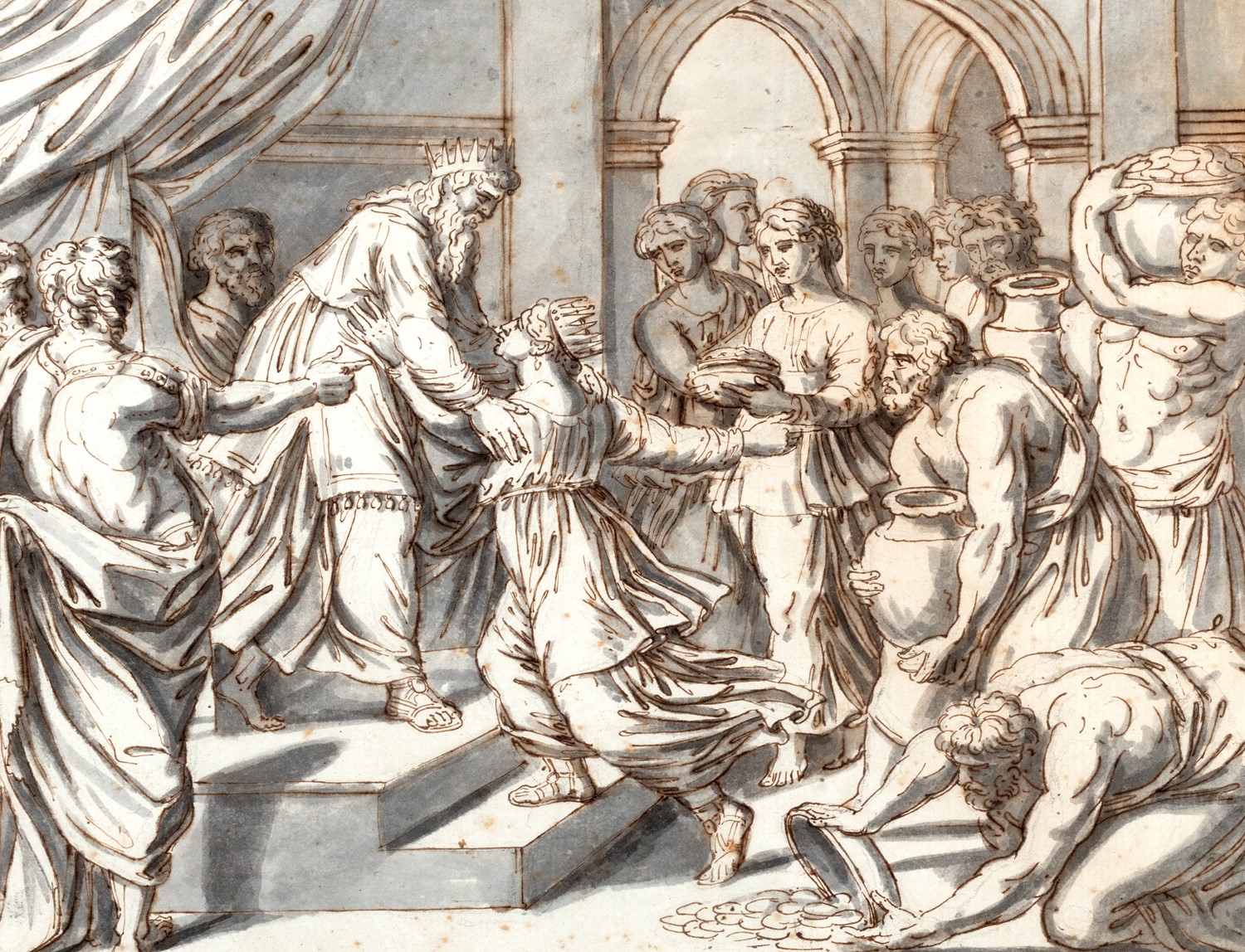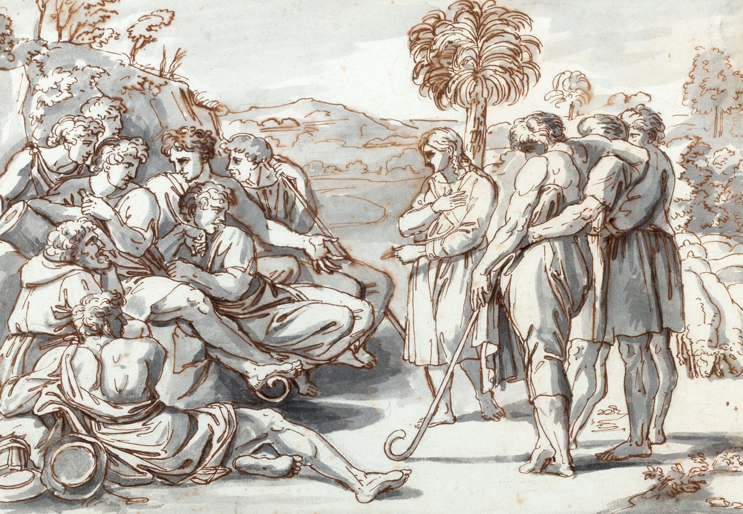 Scuola italiana, fine del secolo XVIII - inizi del secolo XIX, da Raffaello - Coppia di scene bibliche: Giuseppe racconta il sogno ai fratelli, e L'incontro di Salomone con la regina di Saba