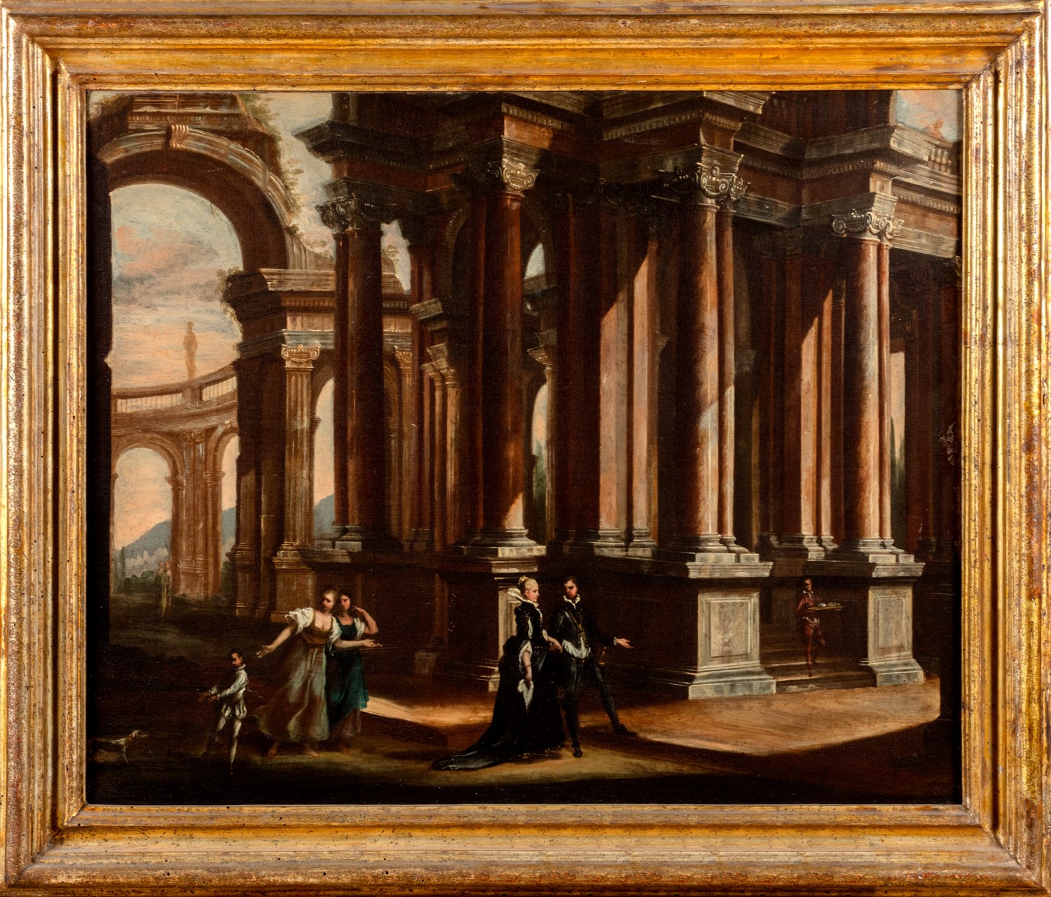 Scuola bolognese, prima metà del secolo XVII - La passeggiata (Coppia galante entro un capriccio architettonico)
