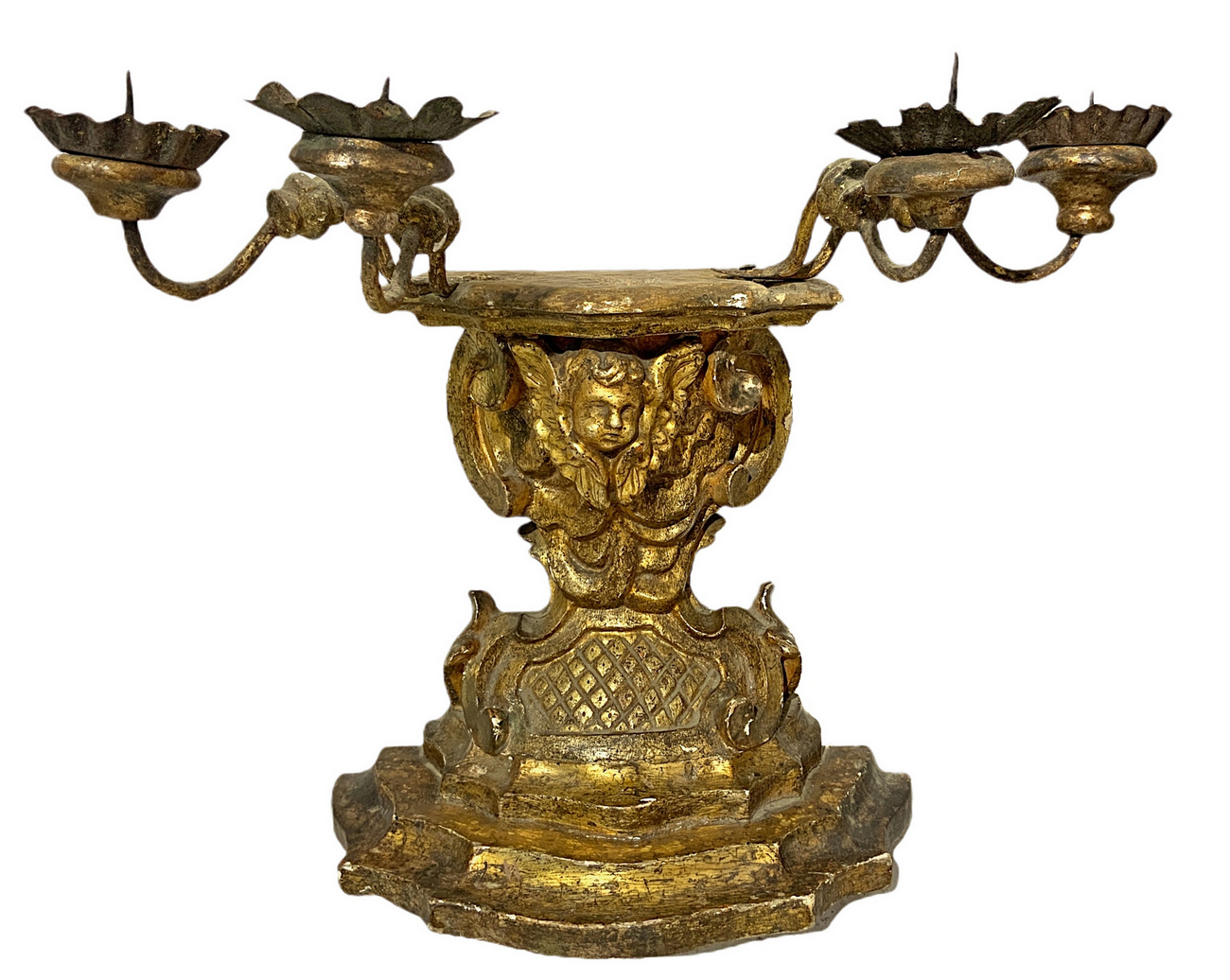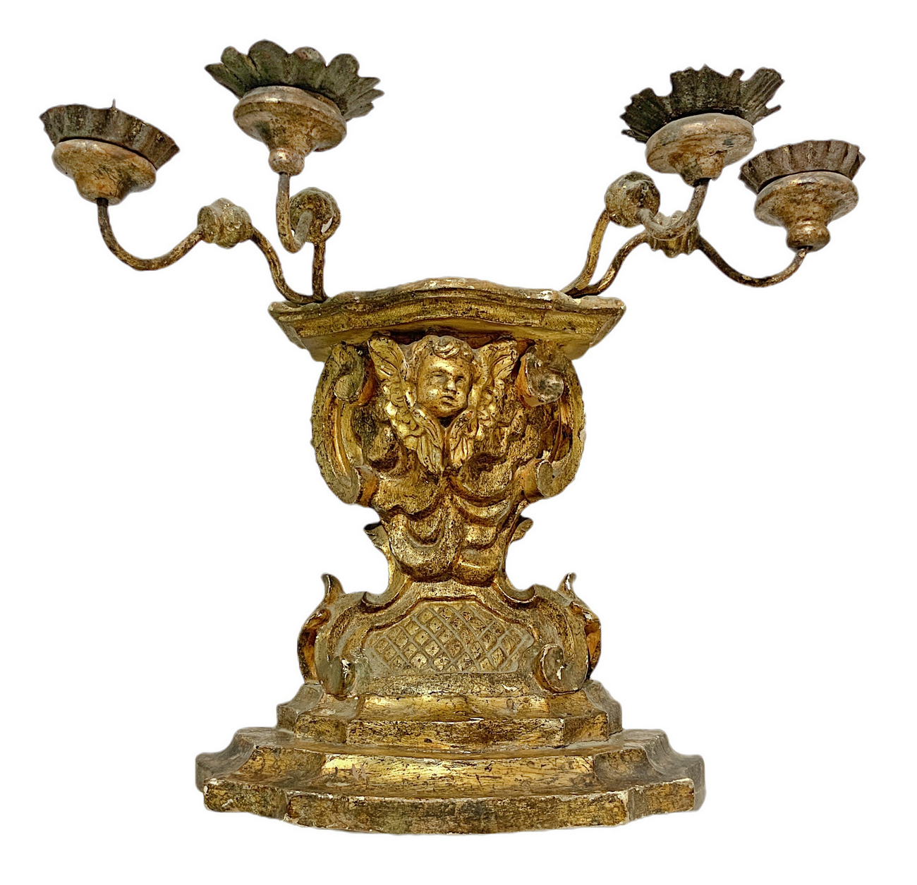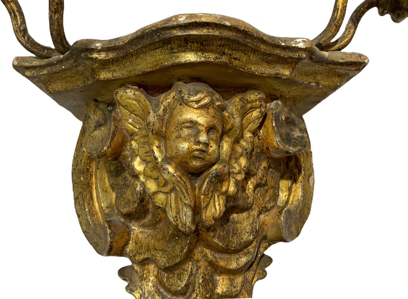 Mensola portacandele a quattro luci in legno dorato a foglia, Sicilia, XVIII secolo. Con braccetti e colacera in metallo