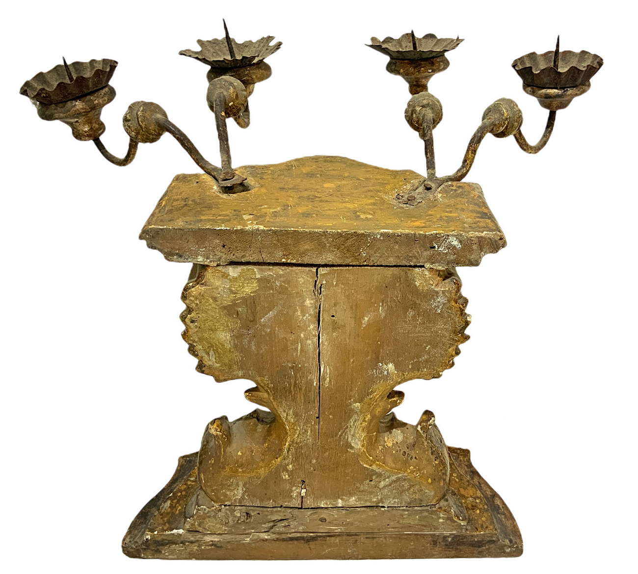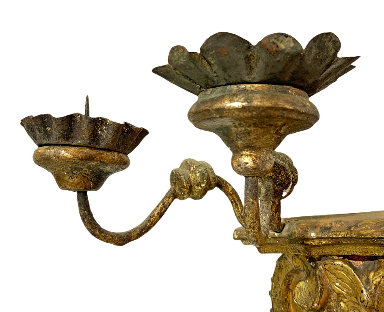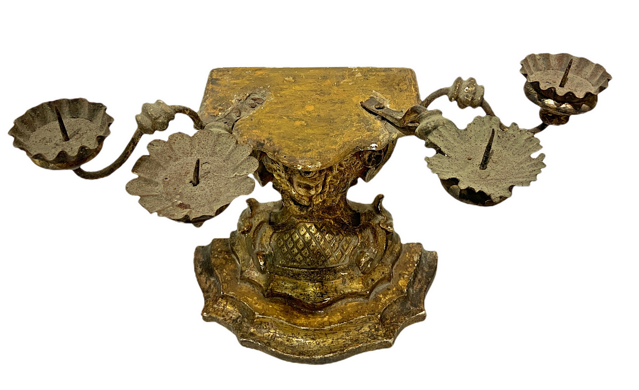 Mensola portacandele a quattro luci in legno dorato a foglia, Sicilia, XVIII secolo. Con braccetti e colacera in metallo. H complessiva cm 33. Base maggiore cm 30, base minore cm 19,5