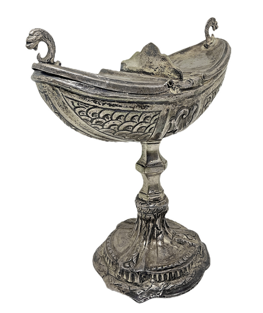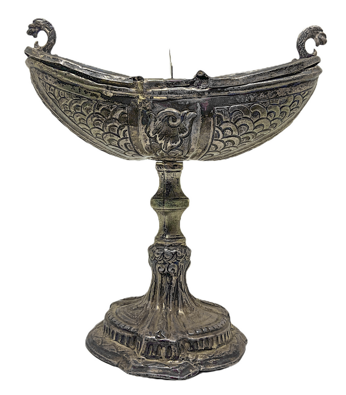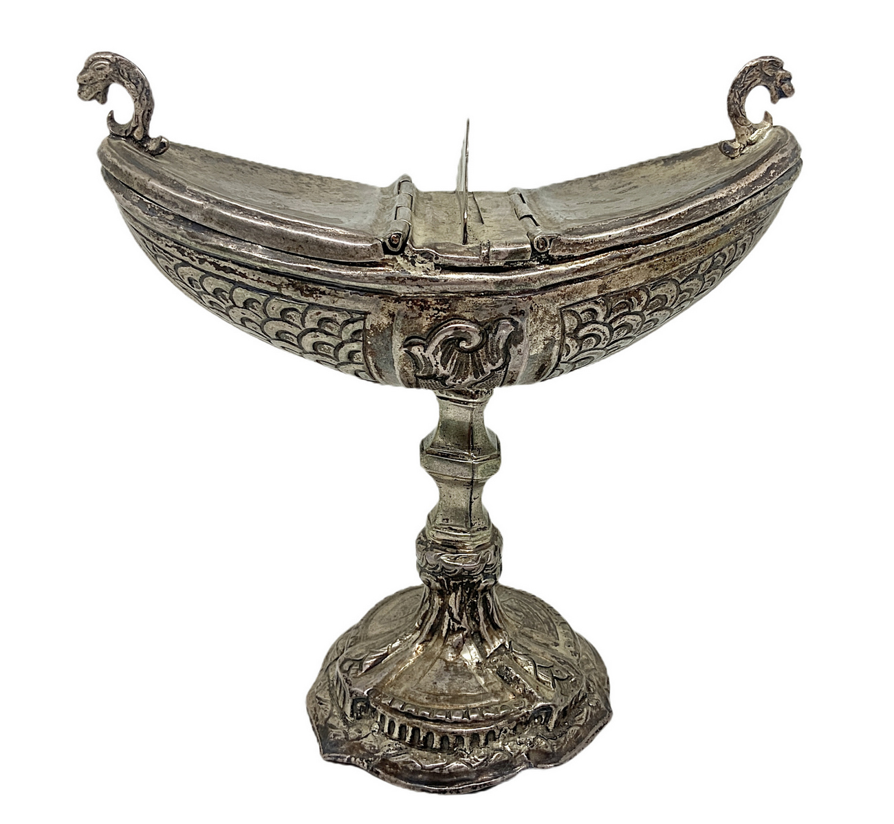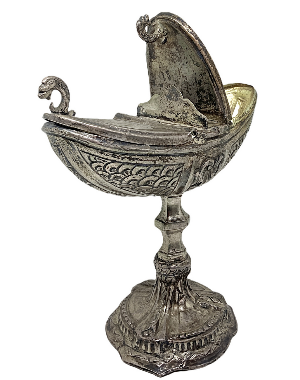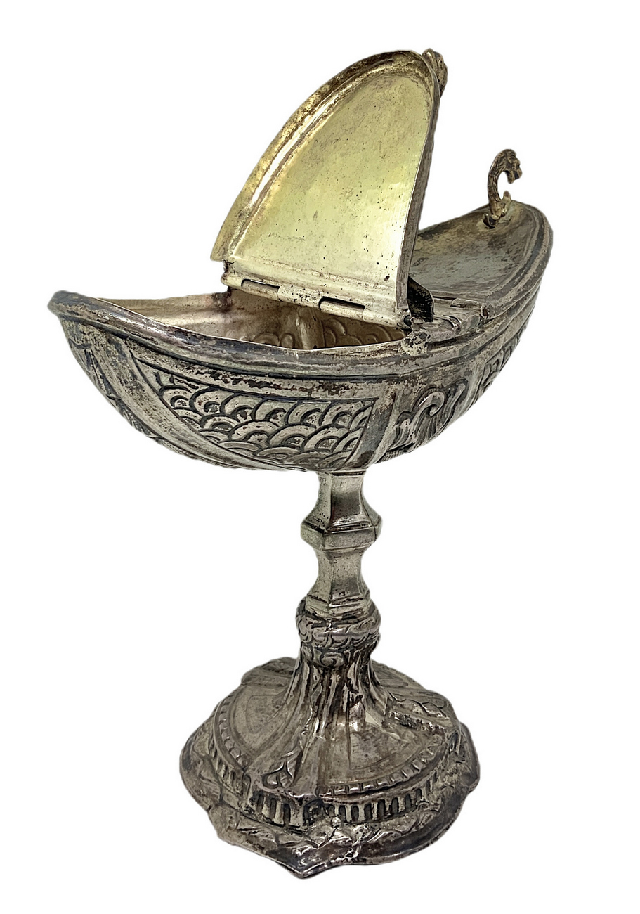 Navetta in argento punzonata Palermo DSC 1790, Palermo, aquila a volo alto, Argentiere Don Simone Chiapparo. H cm 19, per 18,5. Gr 324