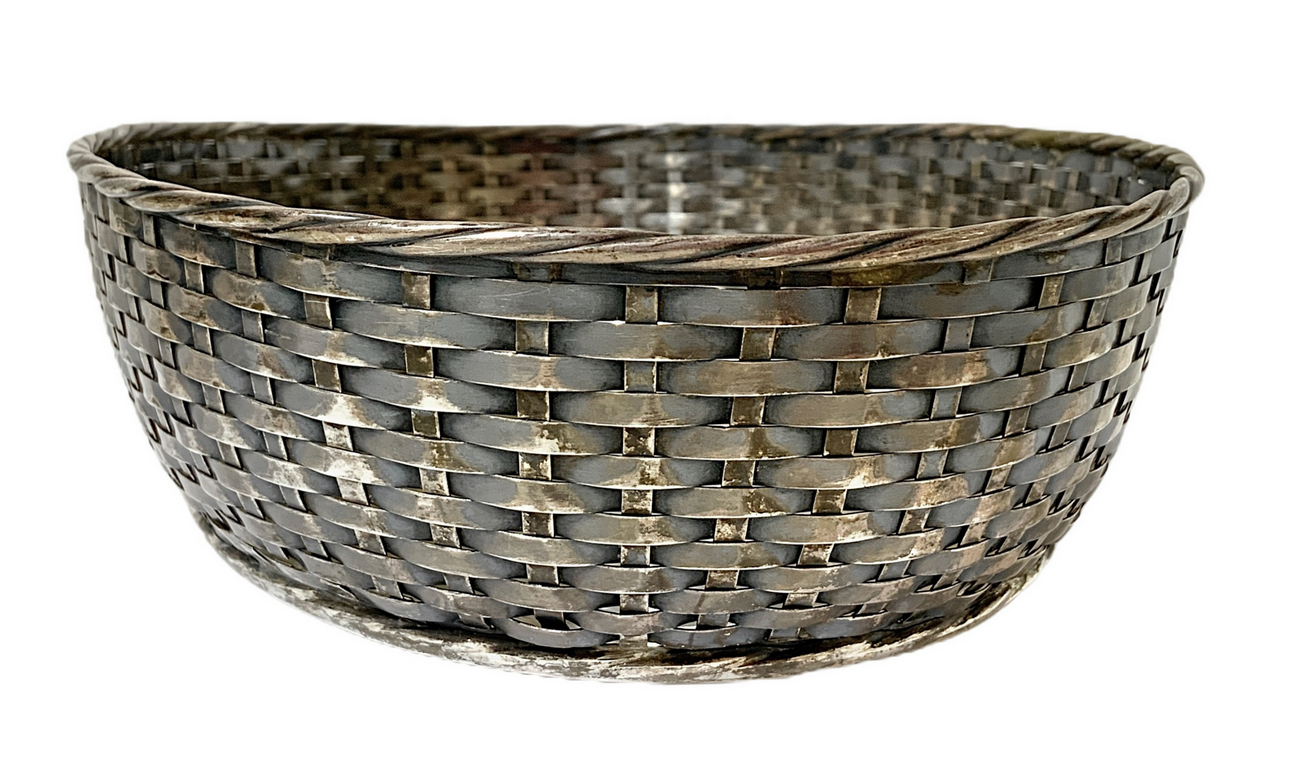Centrotavola ovale in argento, a cesto intrecciato, inizi XX secolo. Gr 514. H cm 8 x27x28