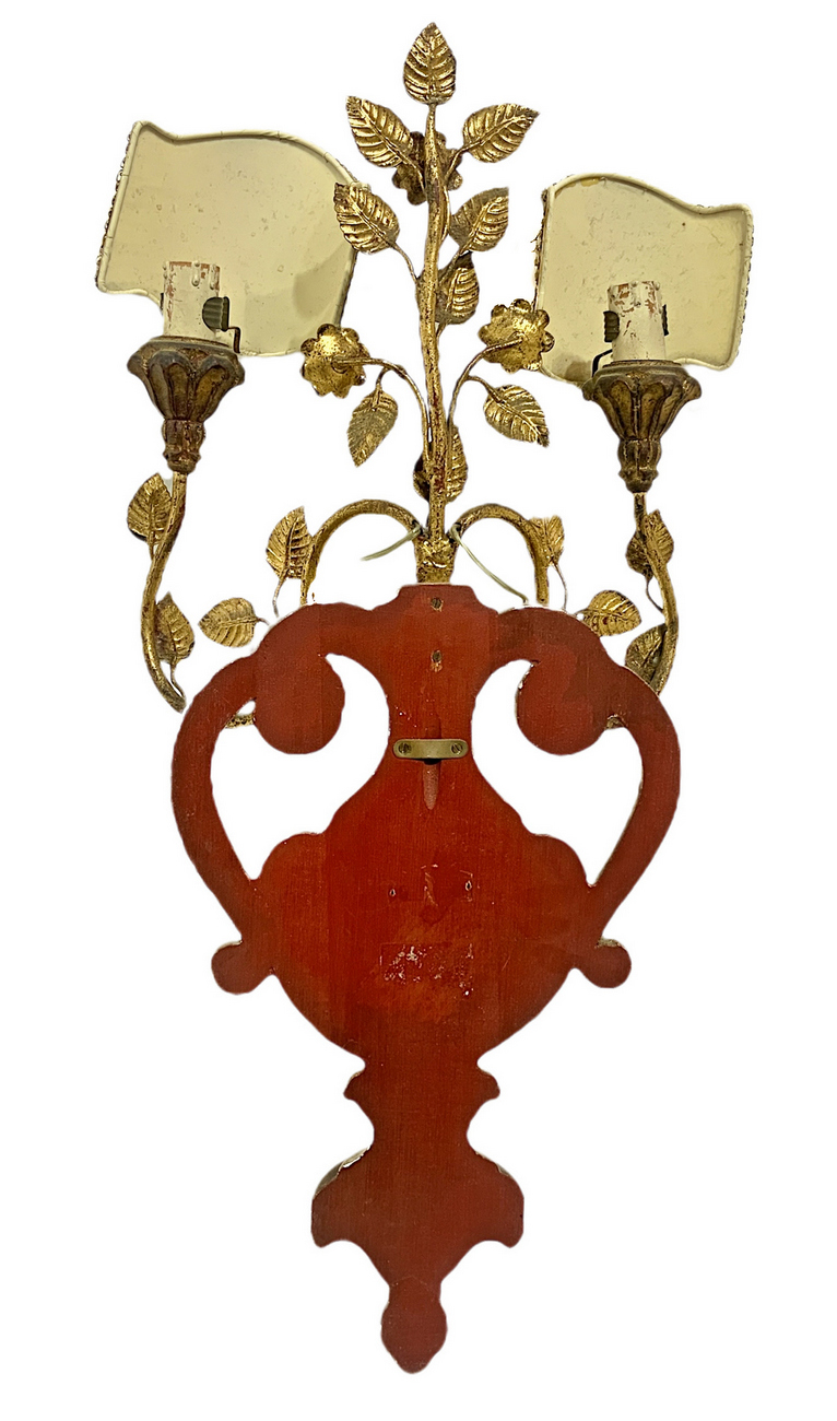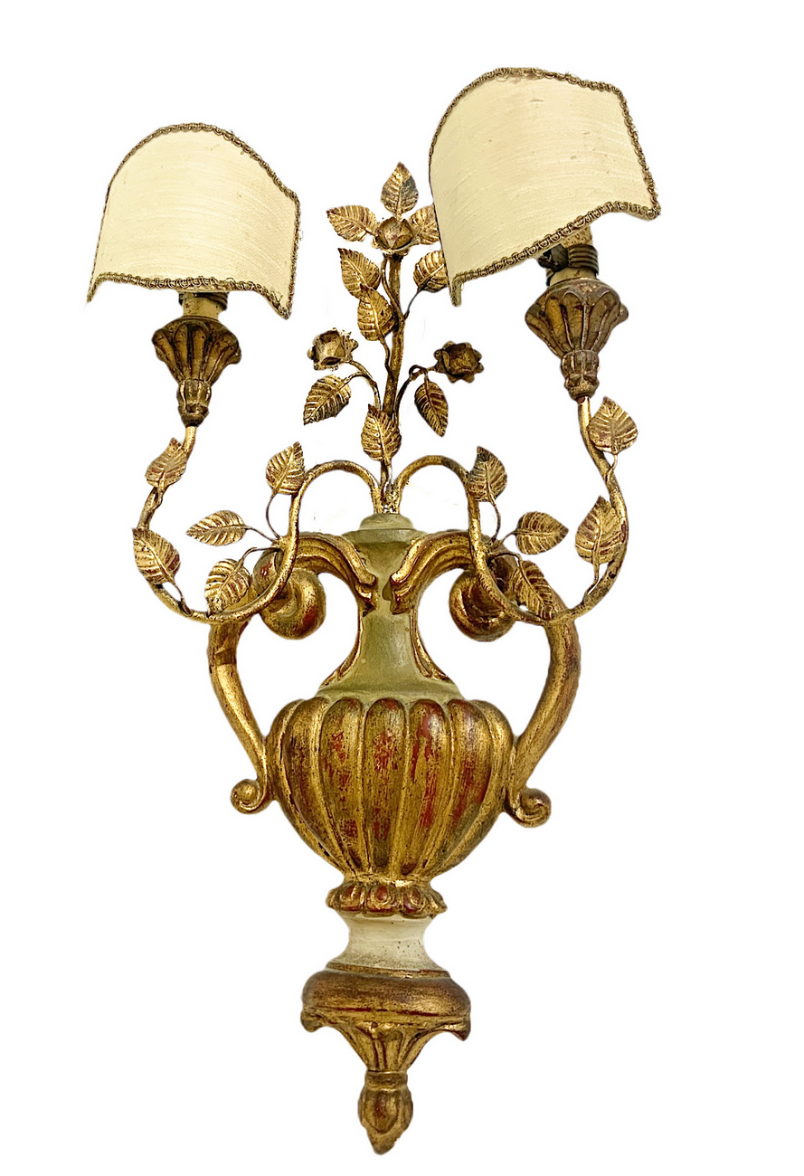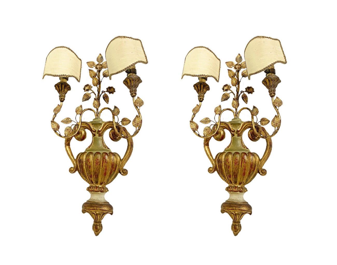 Coppia applique a forma di vasi in legno e metallo laccato e dorato, a due luci, inizi XX secolo. H cm 58