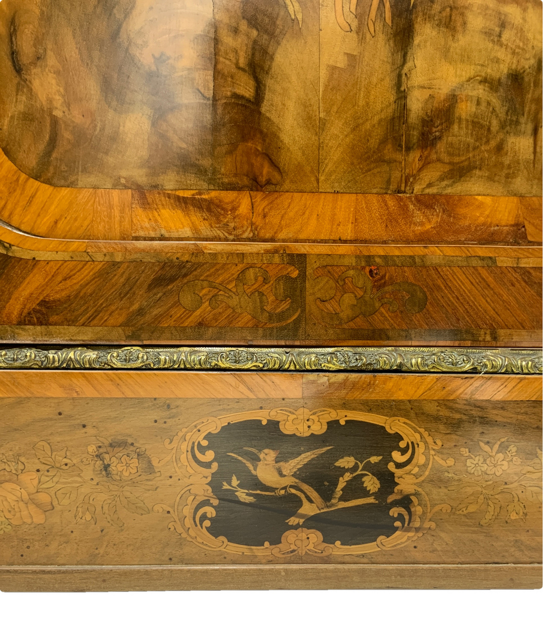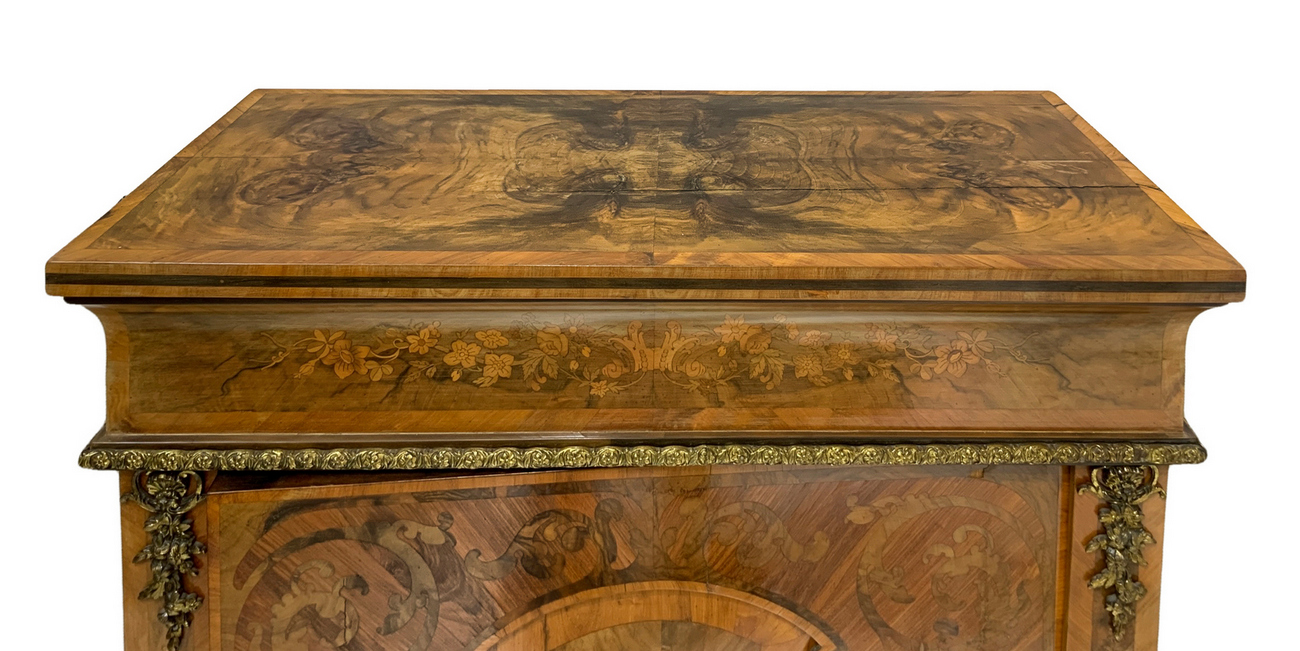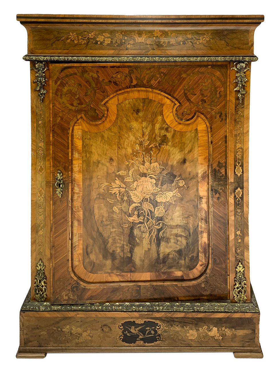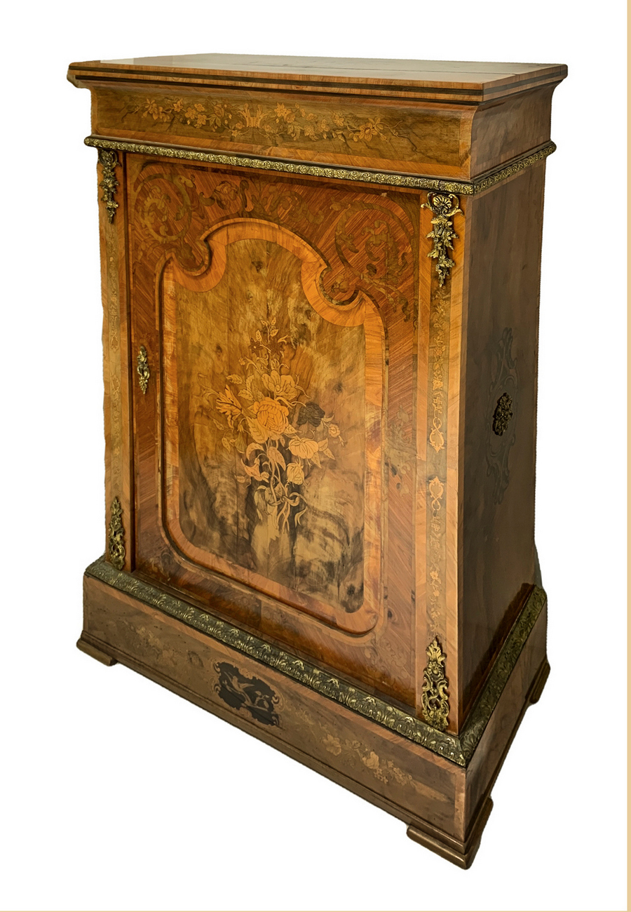 Piccola credenza bassa ad un'anta, Francia , inizi XIX secolo. Intarsi floreali sul fronte, piano in radica d’ulivo entr