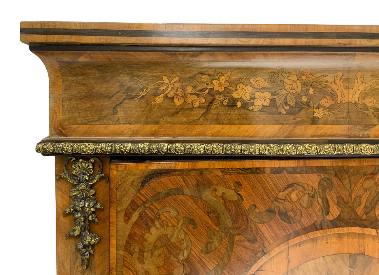 Piccola credenza bassa ad un'anta, Francia , inizi XIX secolo. Intarsi floreali sul fronte, piano in radica d’ulivo entro riserve in bois de rose. Inserti e cornici in metallo dorato. H cm 116x80x35