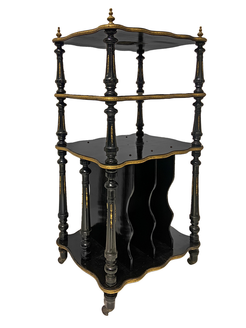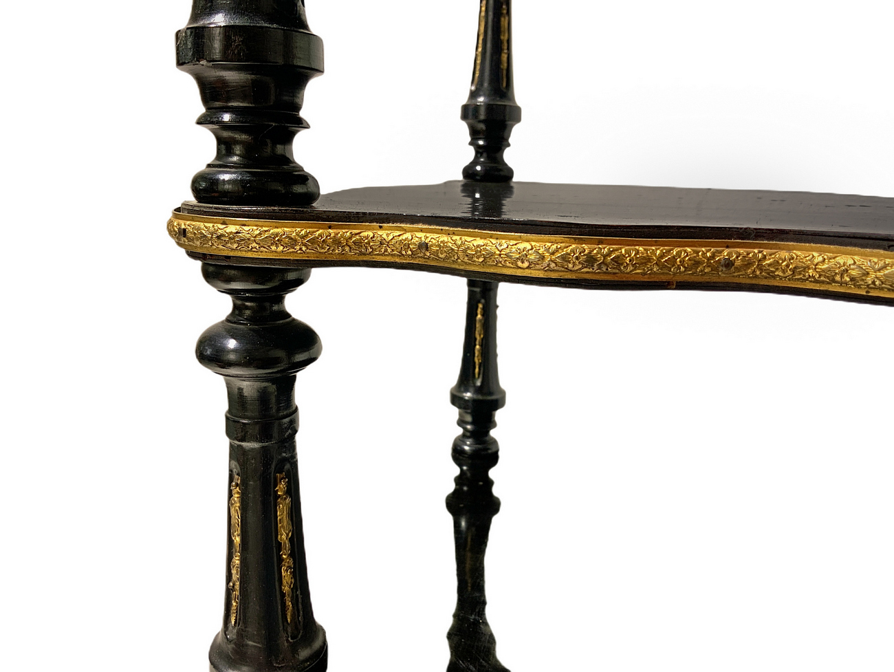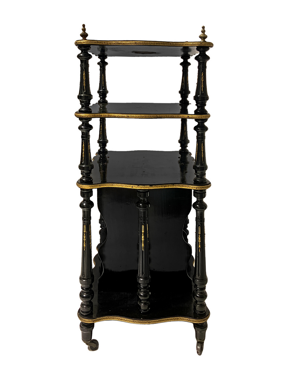 Tavolinetto etagere in legno laccato ebanizzato nero a quattro ripiani smerlati e bordati in ottone dorato. Base con ruote, Napoleone III. H cm 90, ripiano cm 46x37