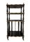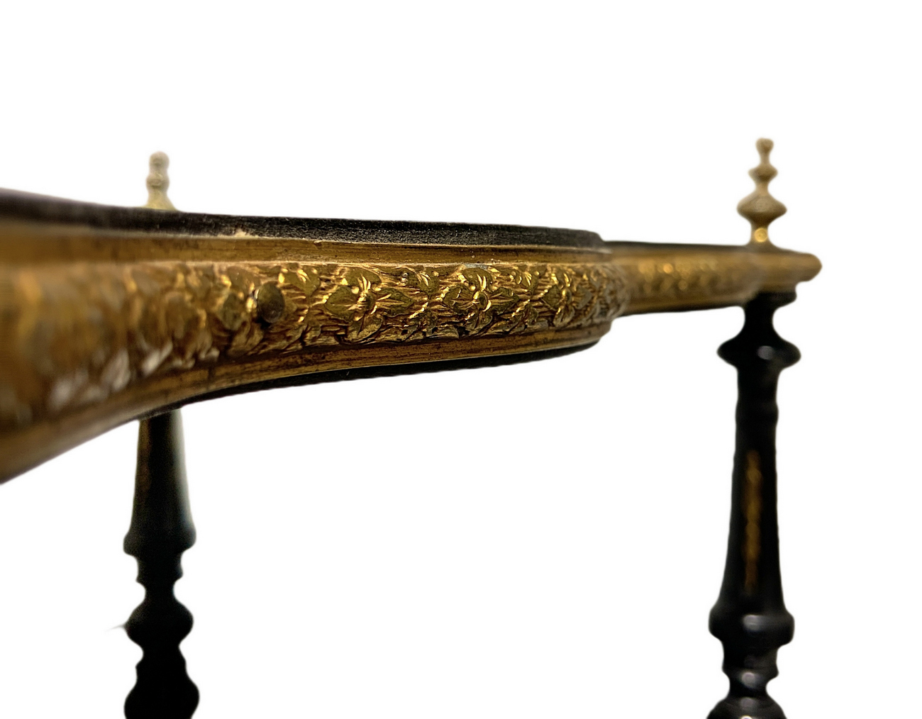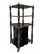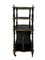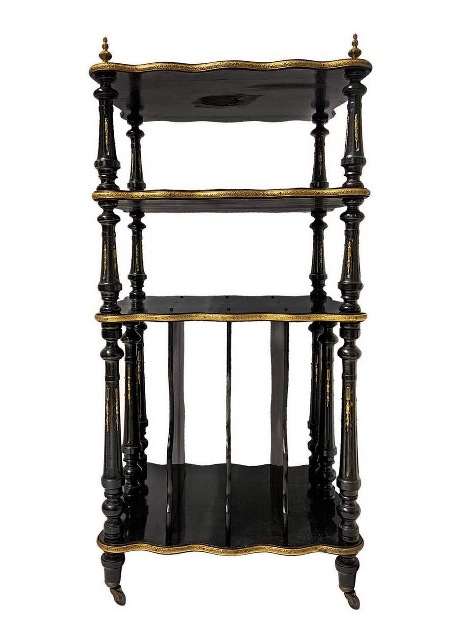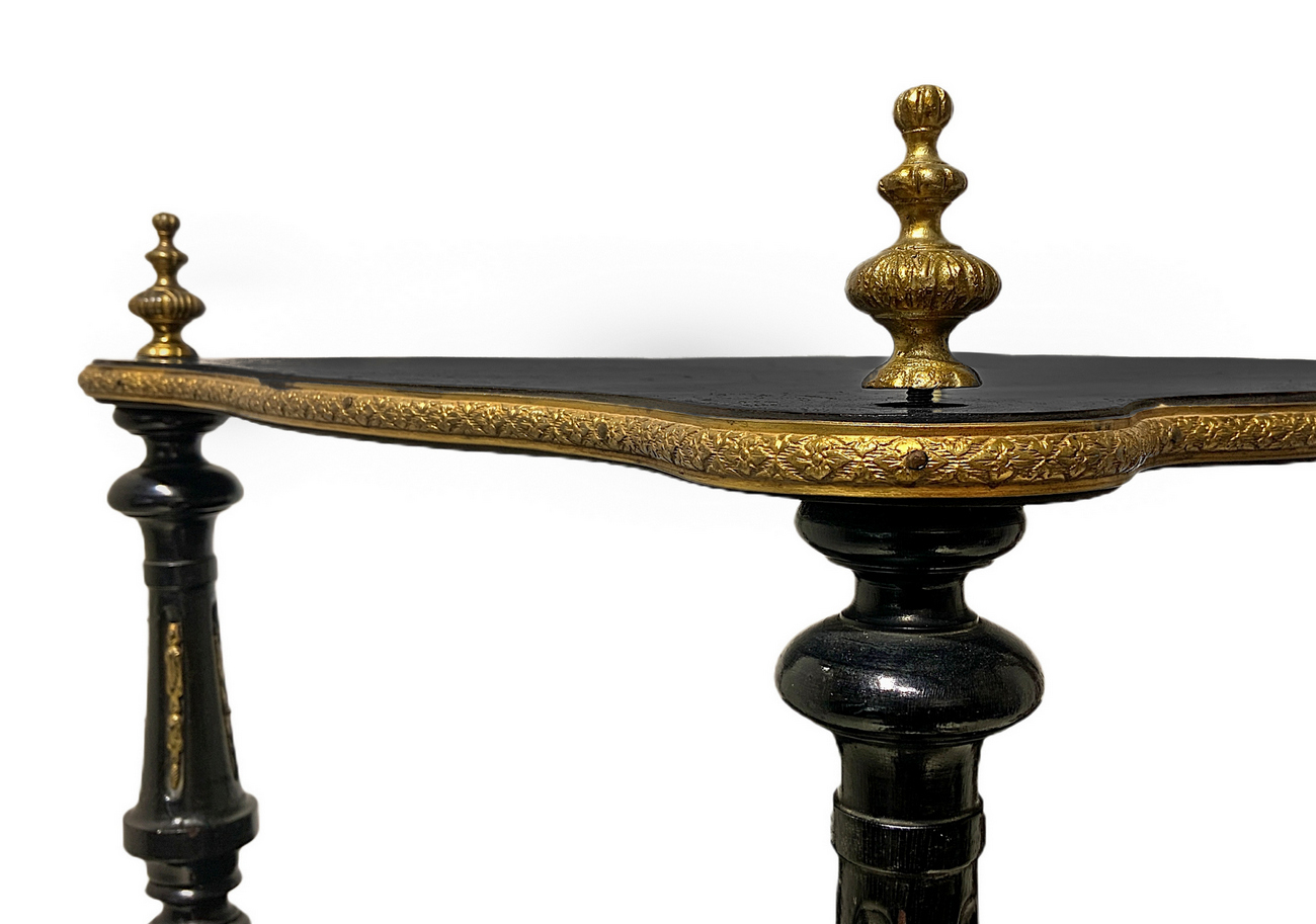 Tavolinetto etagere in legno laccato ebanizzato nero a quattro ripiani smerlati e bordati in ottone dorato. Base con ruote, Napoleone III. H cm 90, ripiano cm 46x37
