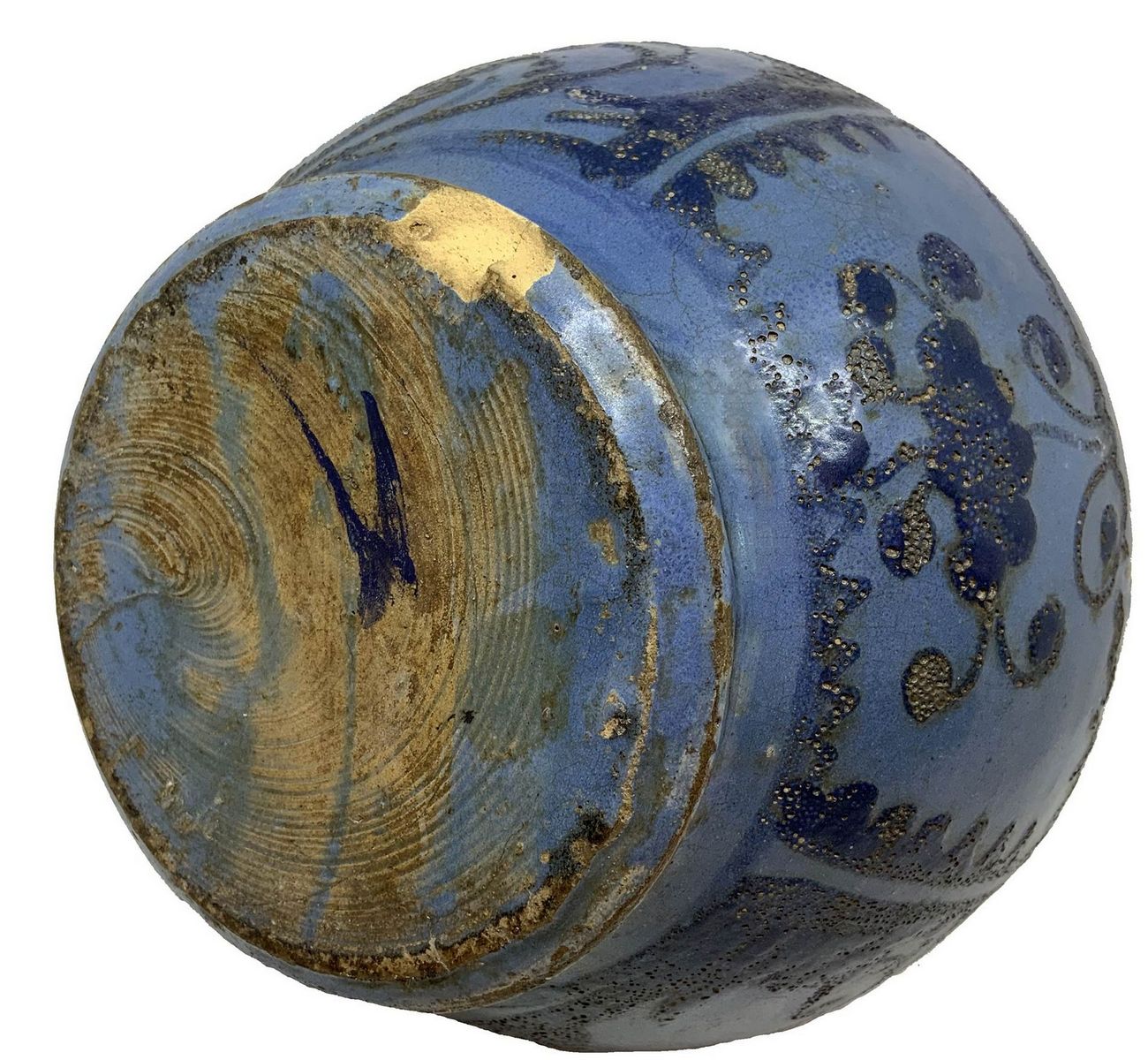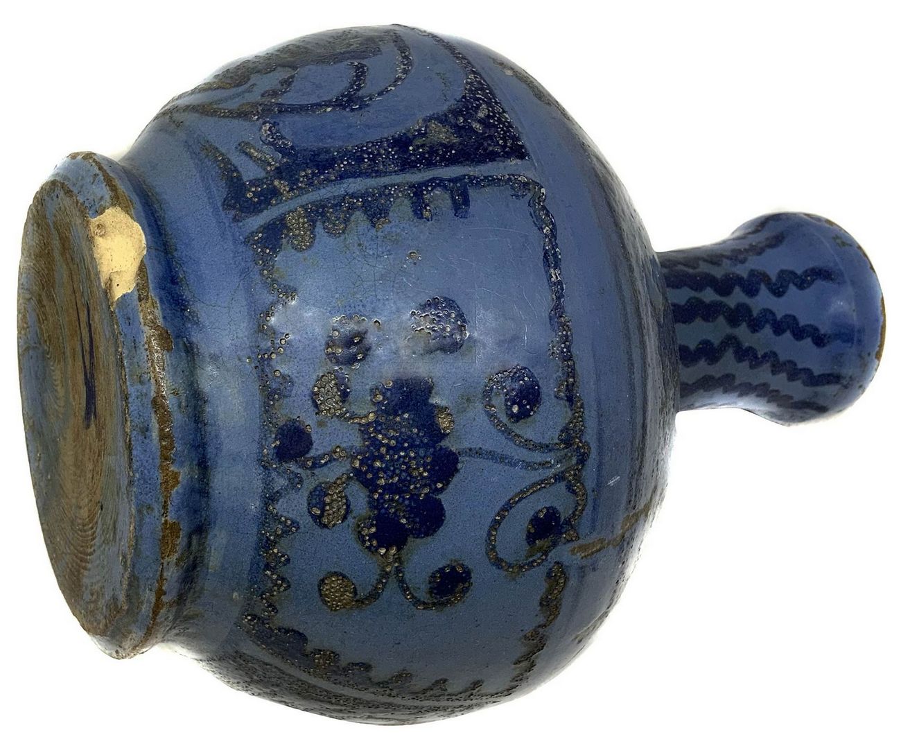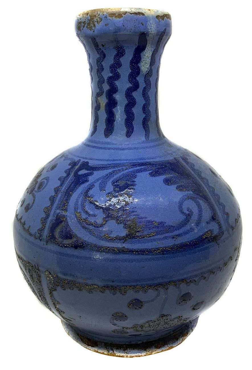 Bottiglia di Caltagirone a smalto azzurro con decori blu con motivi albisolesi. XVII secolo. cm 22