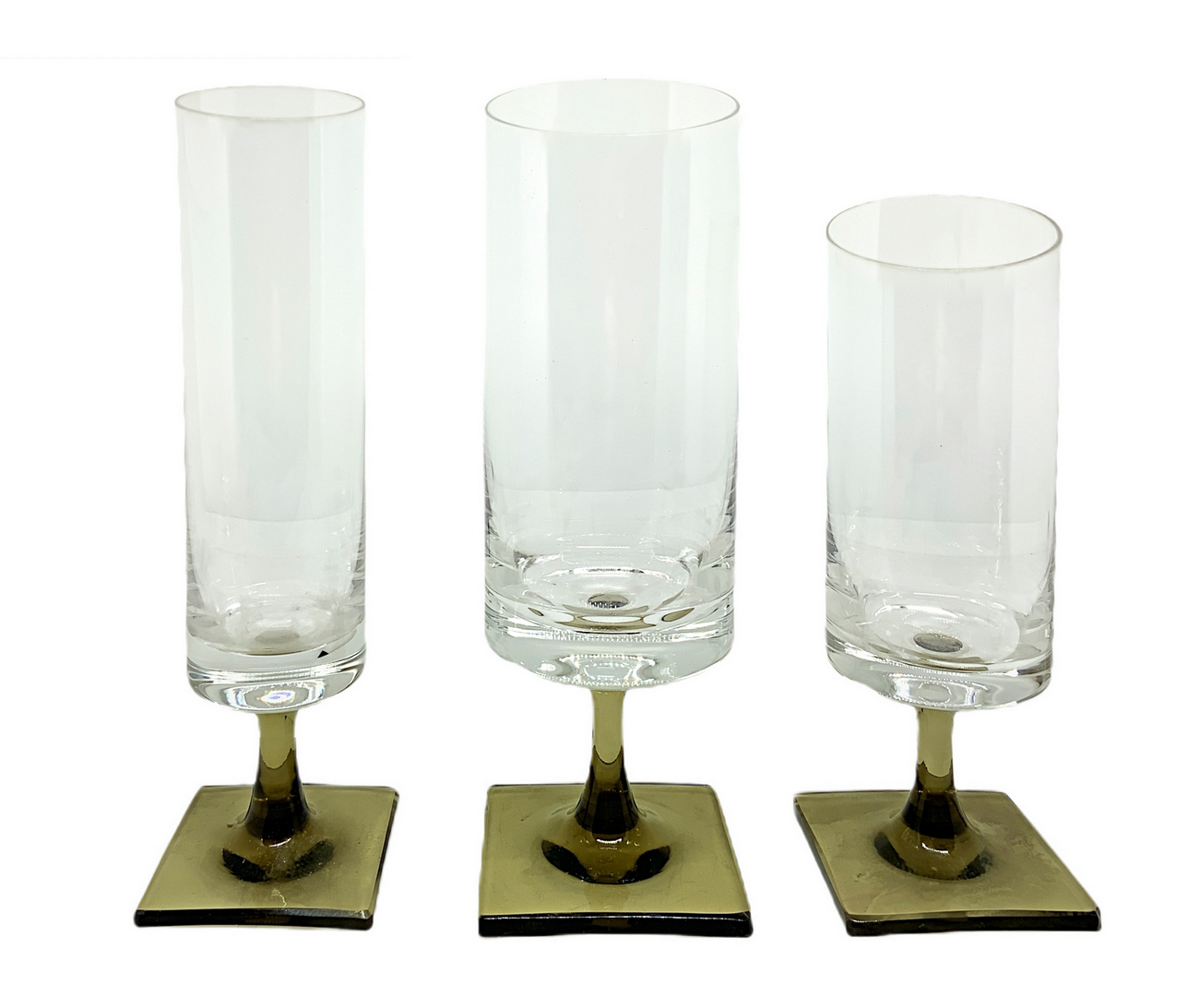 Rosenthal Studio-linie, Georg Jensen, Servizio di bicchieri con base in vetro affumicato anni 50, Berlino. Composto da n. 10 bicchieri da acqua, 10 bicchieri da cocktail, 10 bicchieri da vino.