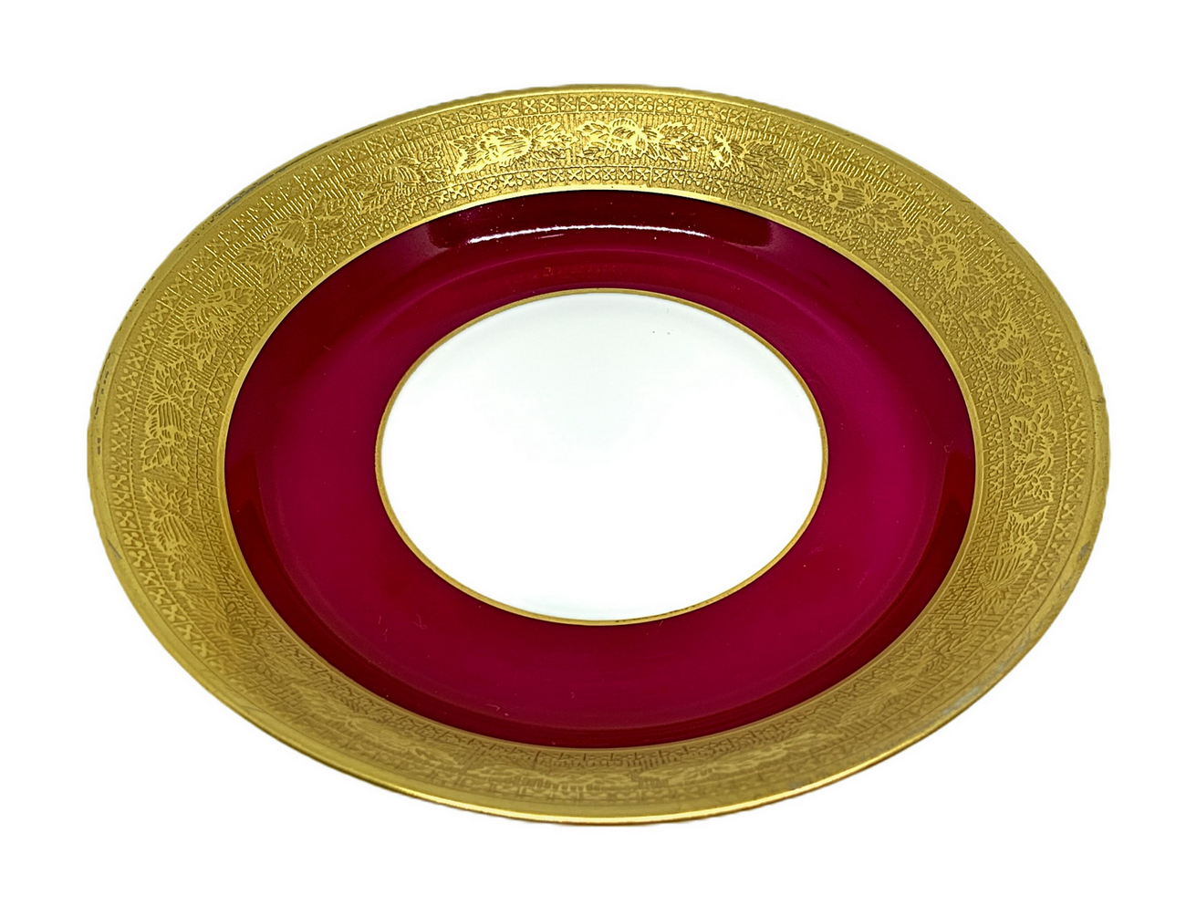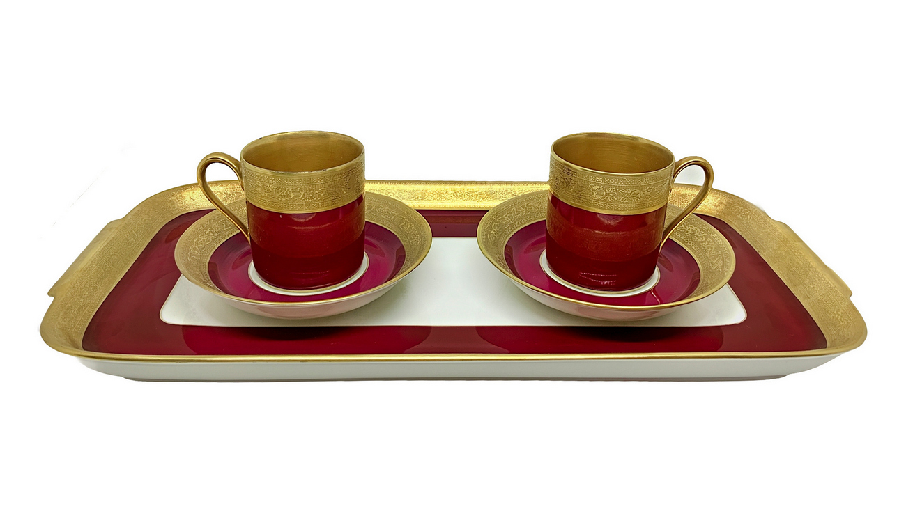 Piccolo servizio caffè tete a tete in porcellana Aofi Porzellan Manufaktur Bavaria,con decorazione in oro e rosso, composto da due tazzine con piattini e vassoio rettangolare. H tazzine con piattino cm 6,5. Vassoio cm 34x16