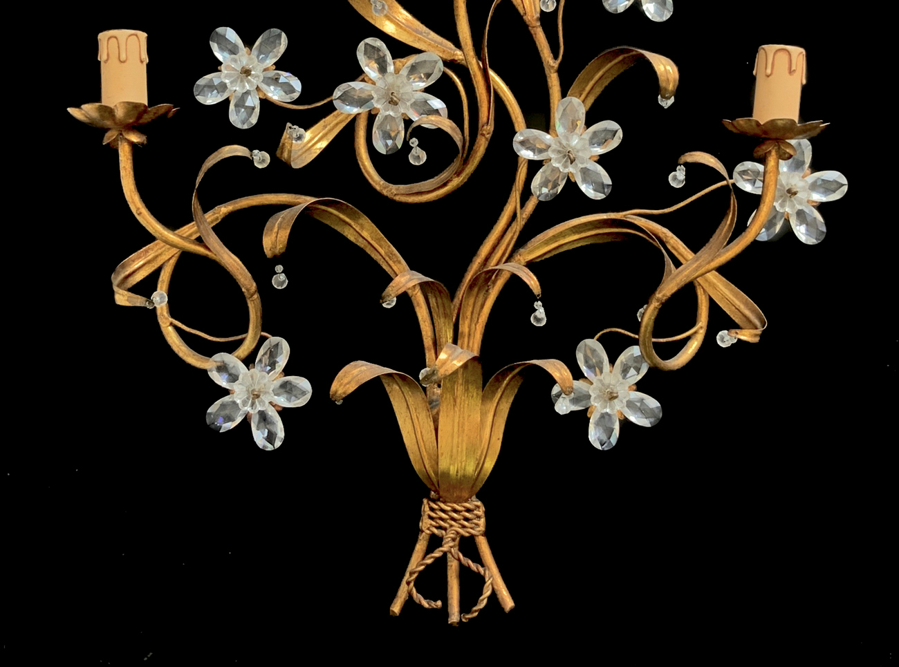 Applique a cinque luci in metallo dorato e cristalli molati con candele in legno, anni ’50. H cm 90, larghezza cm 55