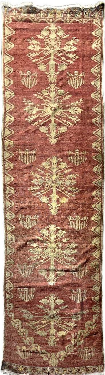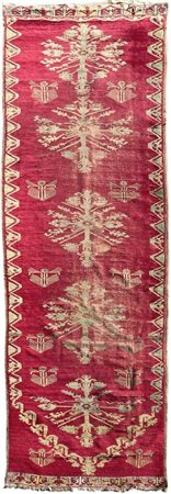 Tappeto Kirsheir, cm 430x100. Anatolia centrale, epoca Mejid, fine ‘800. Ordito, trama e vello in lana, coloranti naturali. Zone consumate nel campo.