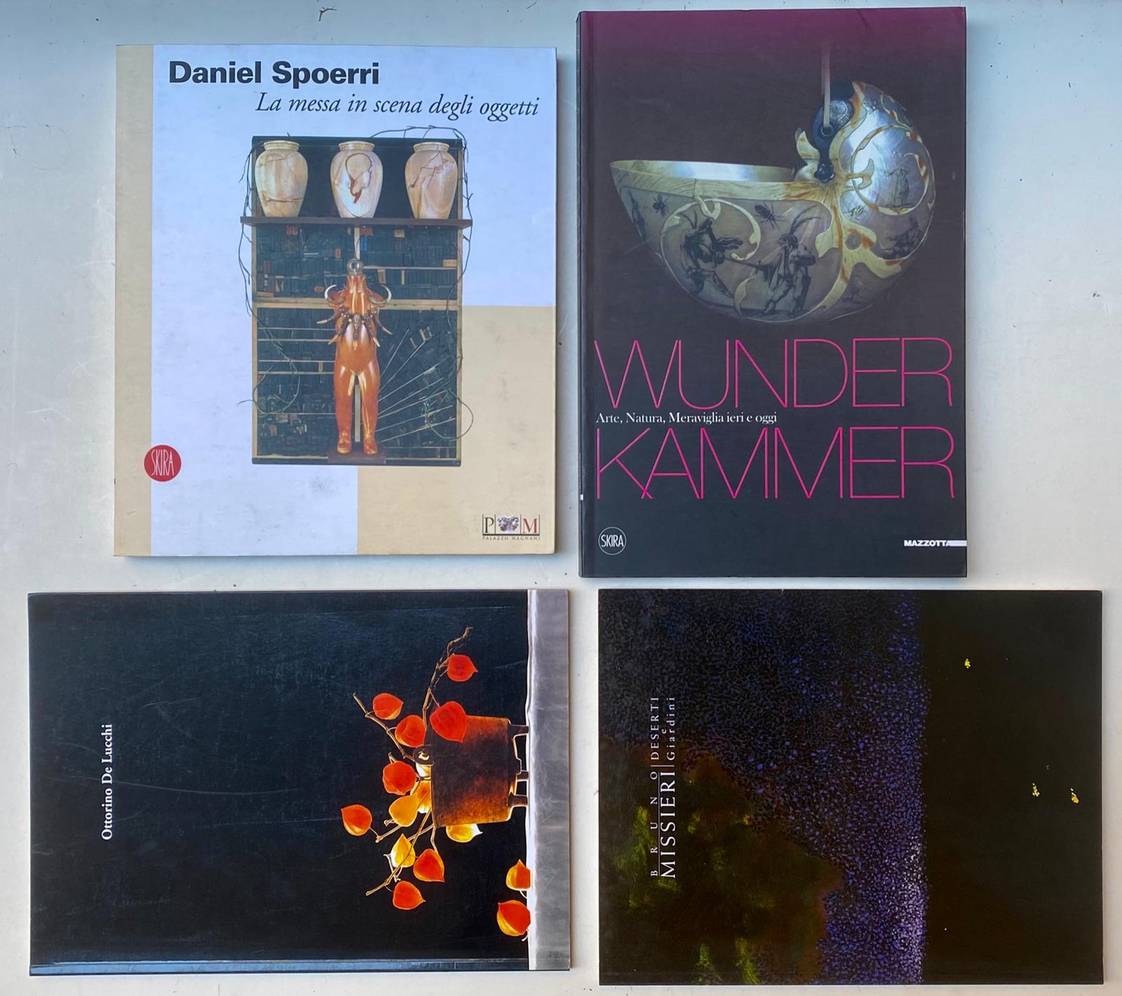 ARTE E NATURA (DE LUCCHI, MISSIERI, SPOERRI) Ottorino De Lucchi, 2002 Catalogo riccamente illustrato Padova Cm 30x21 Pag 49 Bruno Missieri. Deserti e Giardini, 2007 Catalogo riccamente illustrato, a cura di Stefano Fugazza, edito in occasione della mostra dedicata all’artista, presso il Palazzo del Podestà, Piacenza, 2007 Castell’Arquato Cm 28x22 Pag 87Daniel Spoerri. La messa in scena degli oggetti, 2004 Catalogo riccamente illustrato, a cura di Sandro Parmiggiani, edito in occasione della mostra dedicata all’artista, presso il Palazzo Magnani, Reggio Emilia, 2004 Skira Editore, Milano Cm 28x24 Pag 186Wunderkammer. Arte, Natura, Meraviglia ieri e oggi, 2014 Catalogo riccamente illustrato, edito in occasione della mostra dedicata al tema, presso il Museo Poldi Pezzoli, Milano, 2014 Skira Editore, Milano Cm 31x21 Pag 231