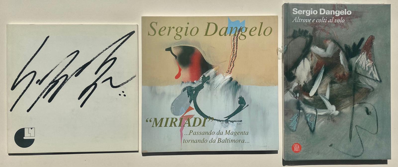 SERGIO DANGELO Sergio Dangelo. Altrove e colti al volo, 2007 Antologia riccamente illustrata, a cura di Luca Tommasi Skira Editore, Milano Cm 25x17 Pag 71 Sergio Dangelo. Colomba al neon, 1988 Catalogo riccamente illustrato, edito in occasione della mostra dedicata all’artista, presso il Centro d’Arte Lino Malagnini, Saronno, 1988 Centro d’Arte Lino Malagnini, Saronno Cm 20x20Sergio Dangelo. “Miriadi”, passando da Magenta tornando da Baltimora, 2008 Catalogo riccamente illustrato, con testo di Carlo Franza Arte Contemporanea Viol@rte, Bergamo Cm 22x22