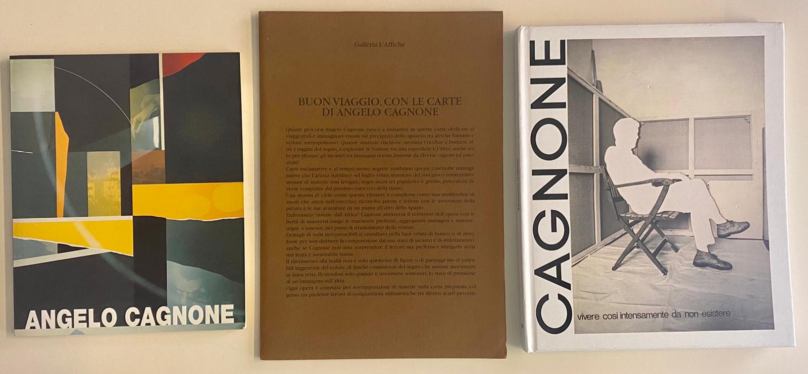 ANGELO CAGNONE Angelo Cagnone, 1997 Catalogo riccamente illustrato, edito in occasione della mostra dedicata all’artista, presso lo Studio Reggiani, Milano, 1997 Studio Reggiani, Milano Cm 25x20 Pag 59 Buon viaggio. Con le carte di Angelo Cagnone, 1996 Catalogo riccamente illustrato, edito in occasione della mostra dedicata all’artista, presso la Galleria L’affiche, Milano, 1996 Galleria L’affiche, Milano Cm 31x22Cagnone. Vivere così intensamente da non esistere, 2018 Catalogo riccamente illustrato Galleria Arte 92, Milano Cm 30x24 Pag 81