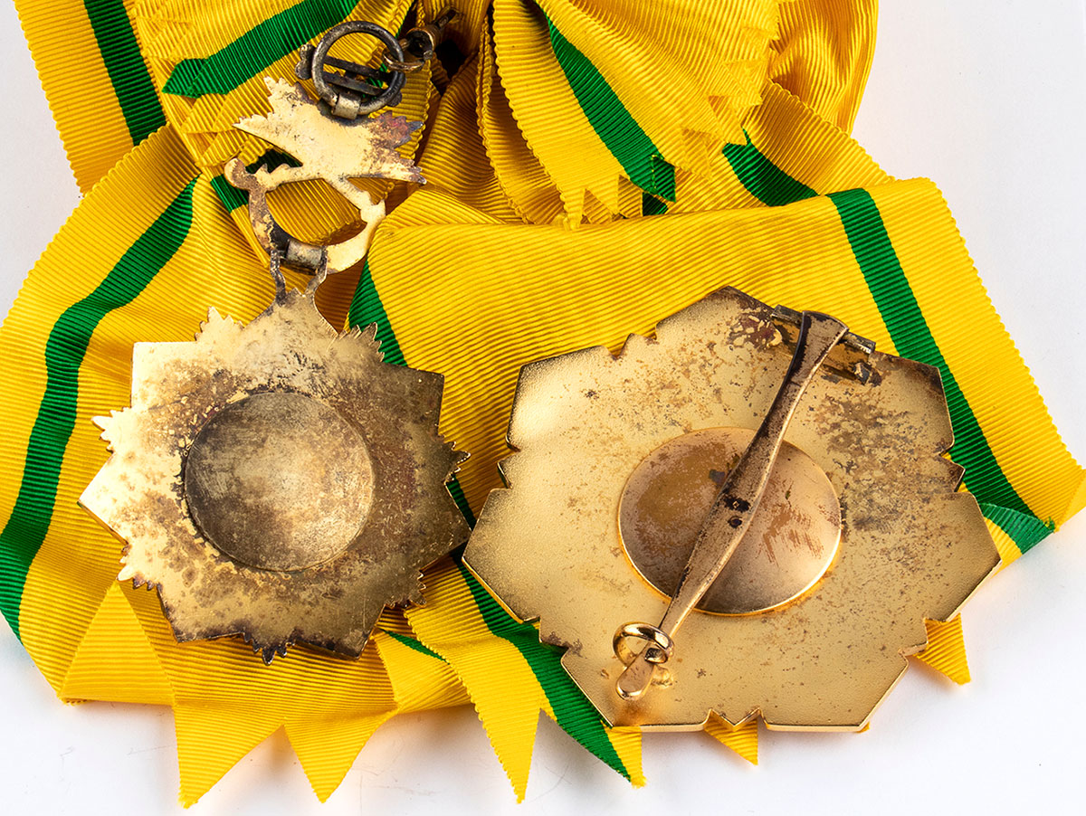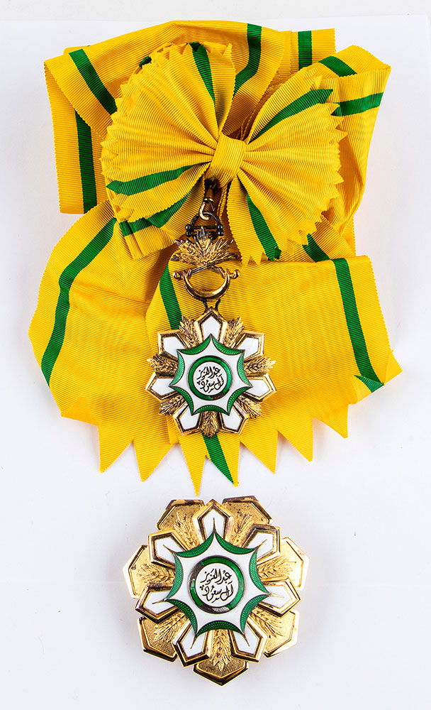 Arabia Saudita, Ordine al Merito di Re Abdul Aziz, insegna di gran croce Set di Gran Croce dell’Ordine del Re Abdul Aziz, placca in argento dorato e smalti, piccolo difetto alla placca centrale,marchi sullo spiullone posteriore, pendente anche con piccolo difetto allo smalto del medaglione centrale, di ottima fattura