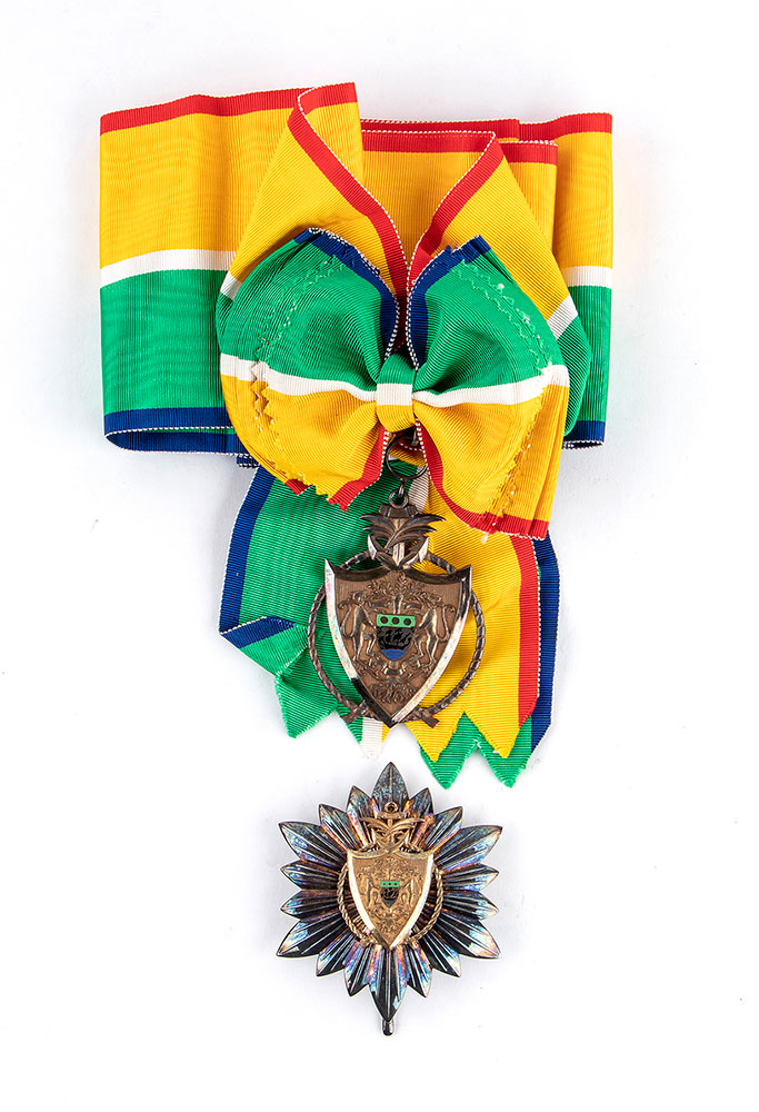 Gabon, Ordine nazionale al Merito, Gran Croce Set di gran croce, placca in argento con applicazioni in argento dorato e smaltii, pendente in argento dorato e smalti, di ottima qualità