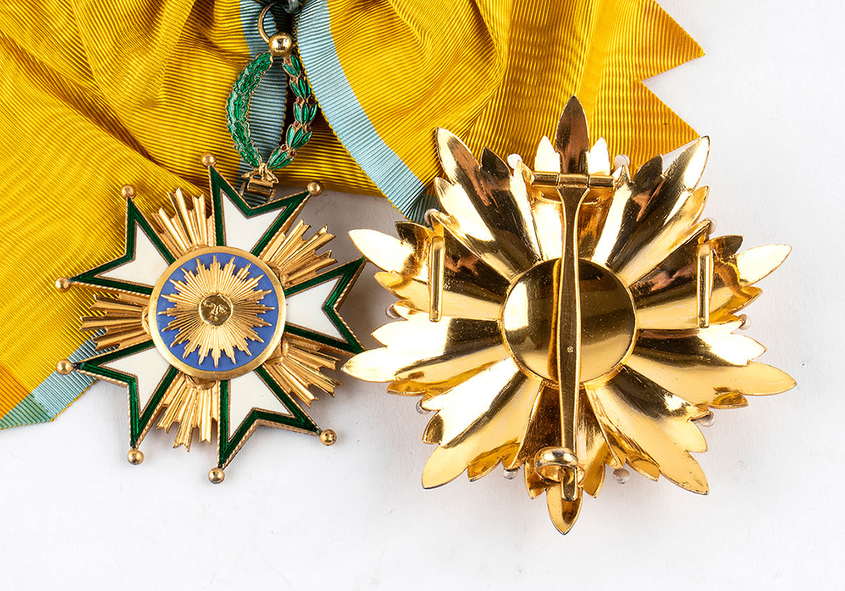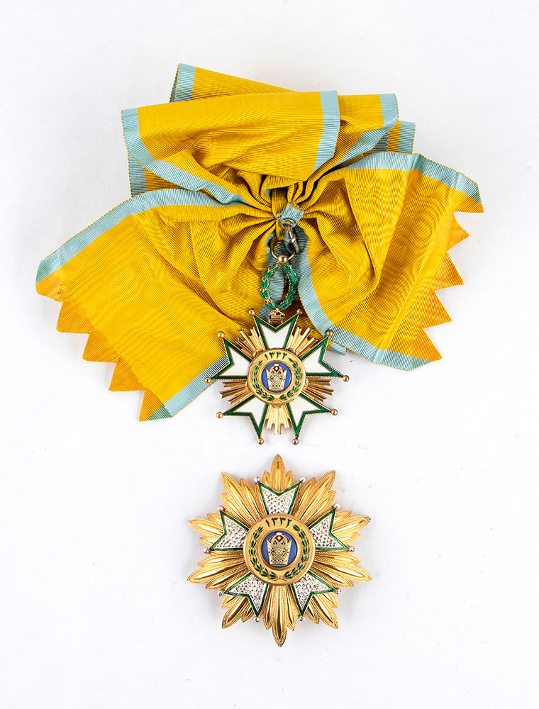 Iran, Ordine della Corona, set di Gran Croce Bellissimo set di Gran Croce dell’Ordine della Corona di Persia, in argento dorato, manifattura grande qualita, placca con applicato medaglione centrale incito a sfaccettature, ottimi gli smalti, doratura molto frescda.
