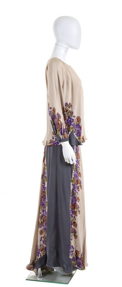 1977 ca Completo ca in seta rosa chiaro e grigio, motivo floreale