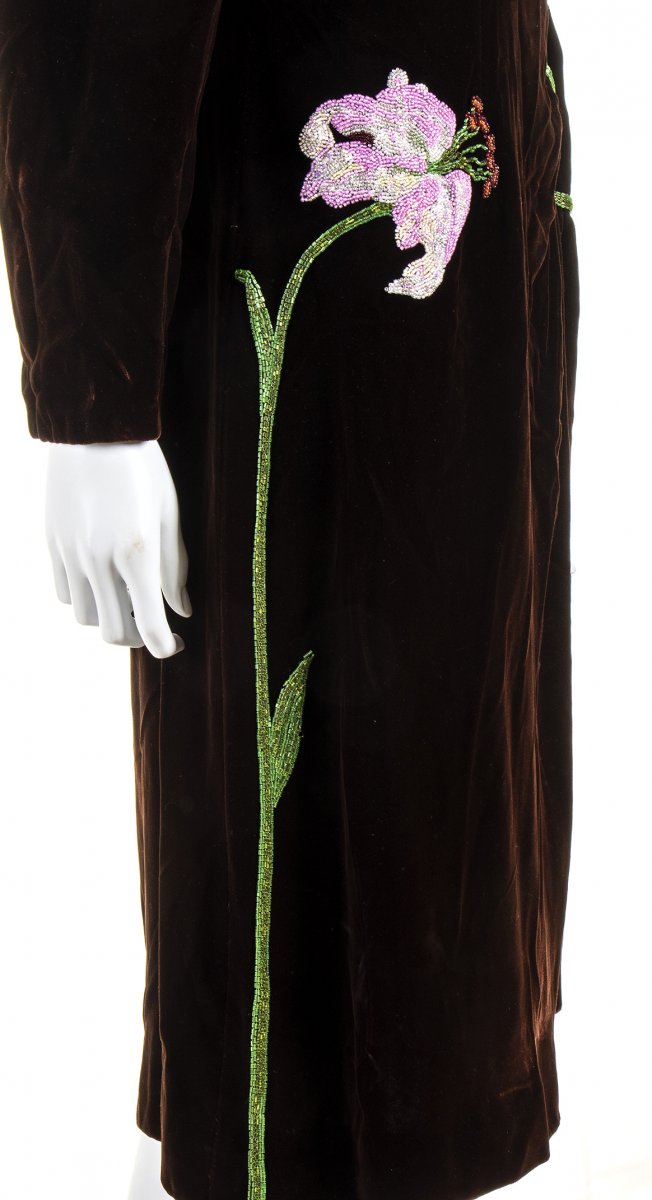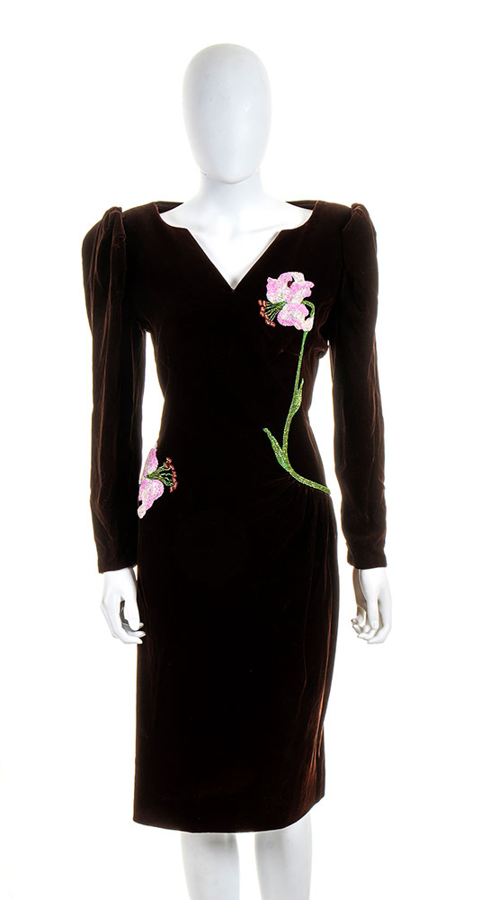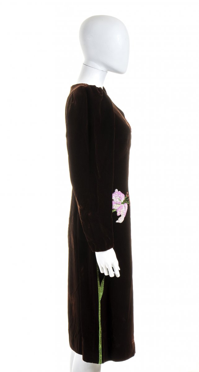 Anni ‘80 Abito in velluto di seta marrone e ricami floreali in perline