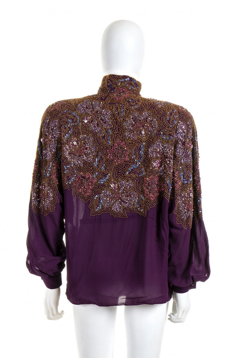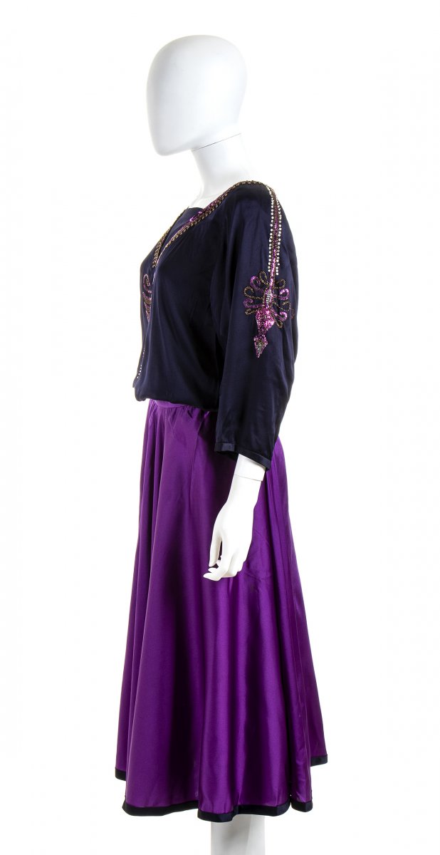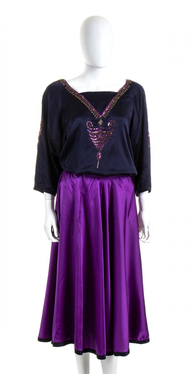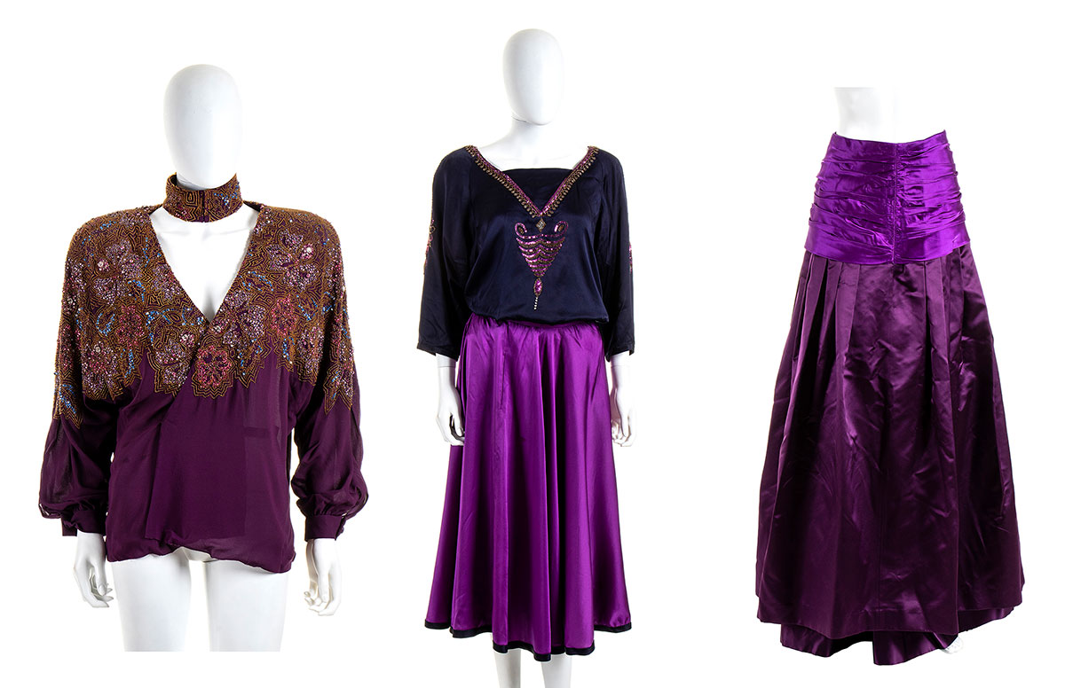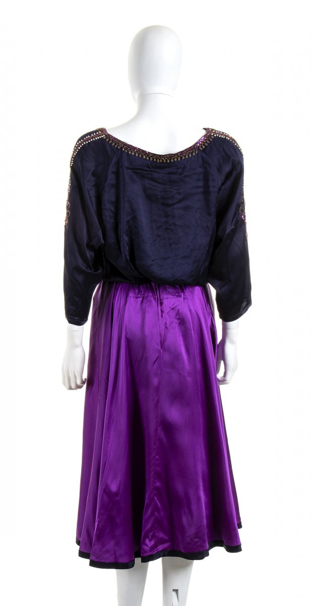Anni ‘80 / Anni ‘90 Lotto di 4 articoli anni 80/90 Mila Schön Alta Moda: 2 gonne in seta viola, una blusa in seta blu scuro con ricamo di perline, una blusa in georgette viola con elaborato ricamo di perline e strass