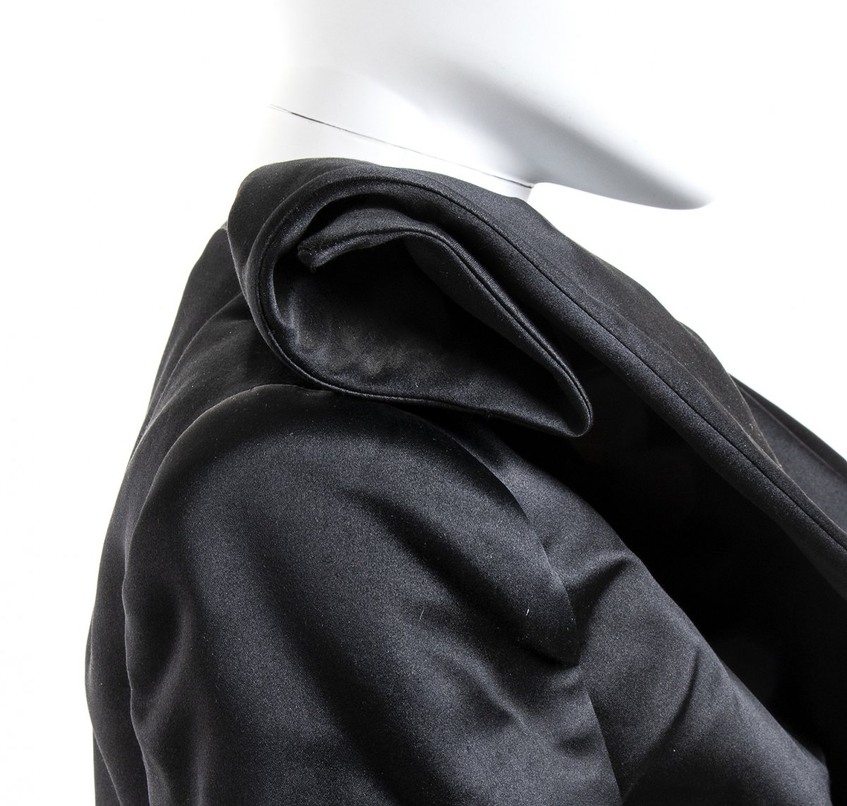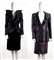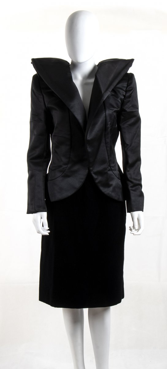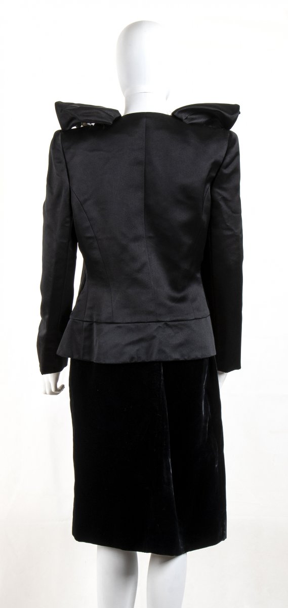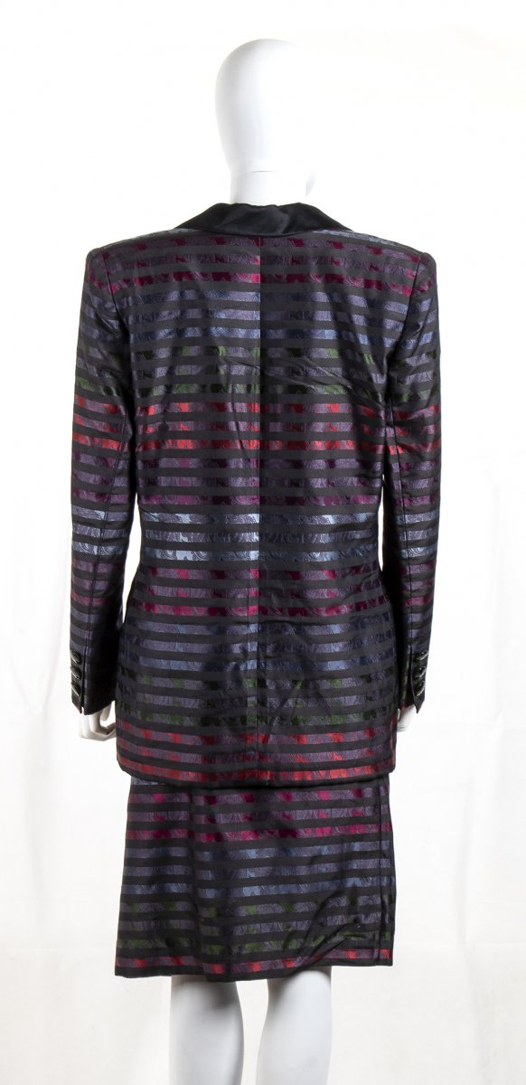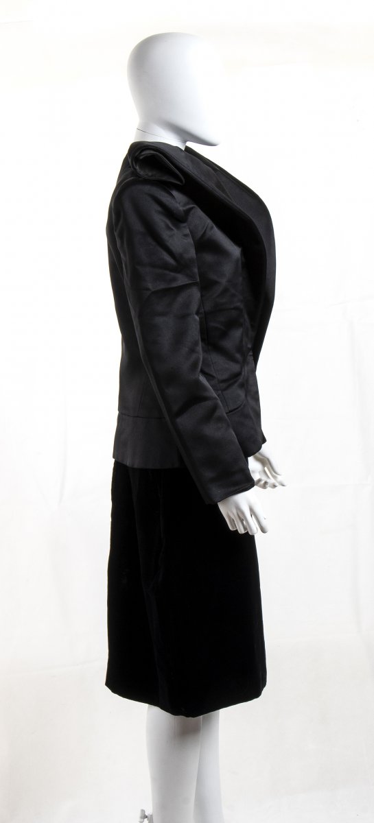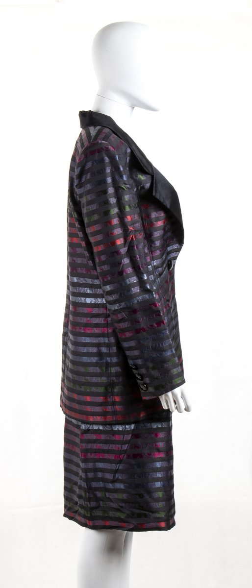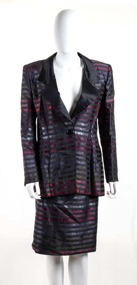 Anni ‘80 Lotto di 2 articoli Mila Schön Alta Moda: completo (giacca e gonna) in raso di seta nero e velluto nero, completo (giacca e gonna) in seta grigio scuro a righe effetto jacquard