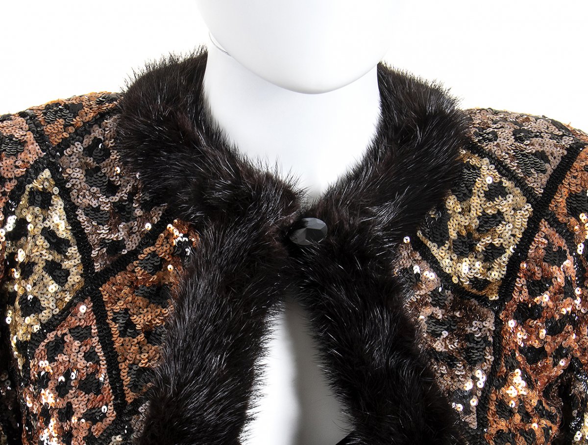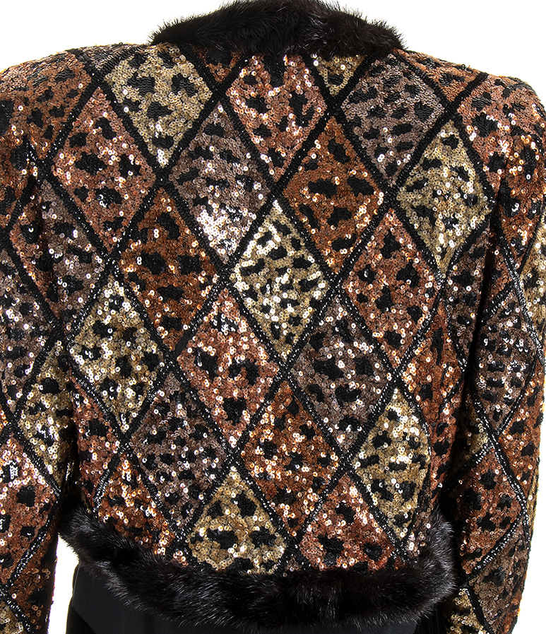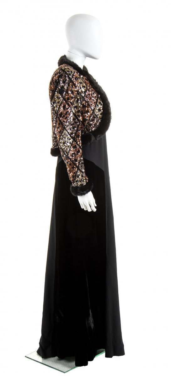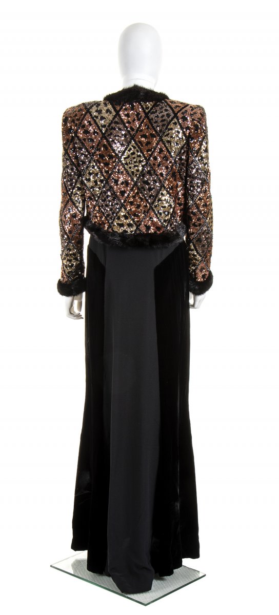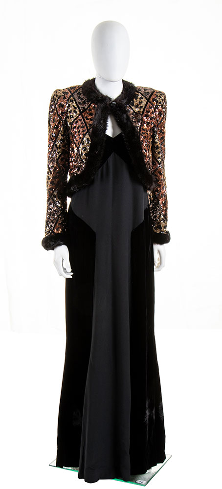 Autunno / Inverno 1983-1984 Completo (abito da sera e bolero) : abito da sera in seta grigio scuro e velluto nero, bolero in paillettes e bordo in pelliccia