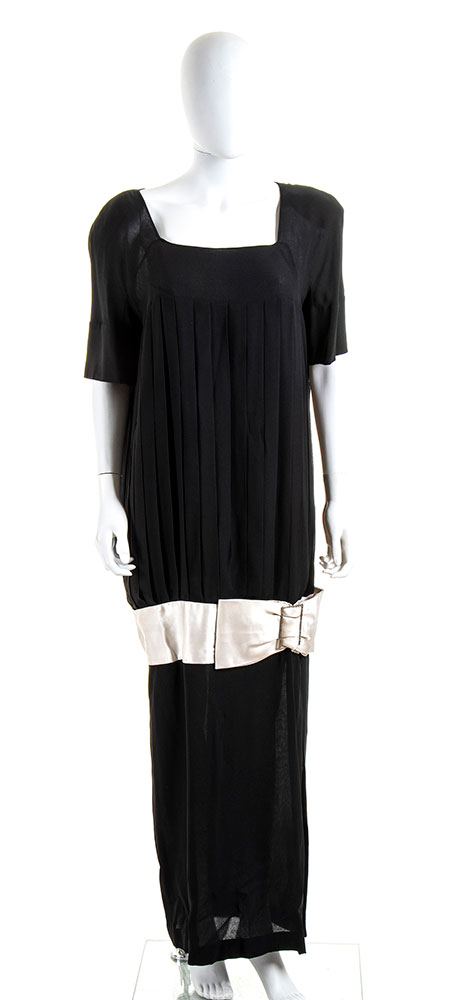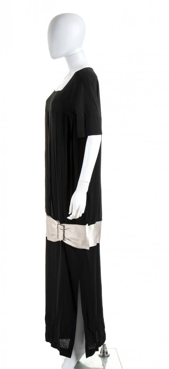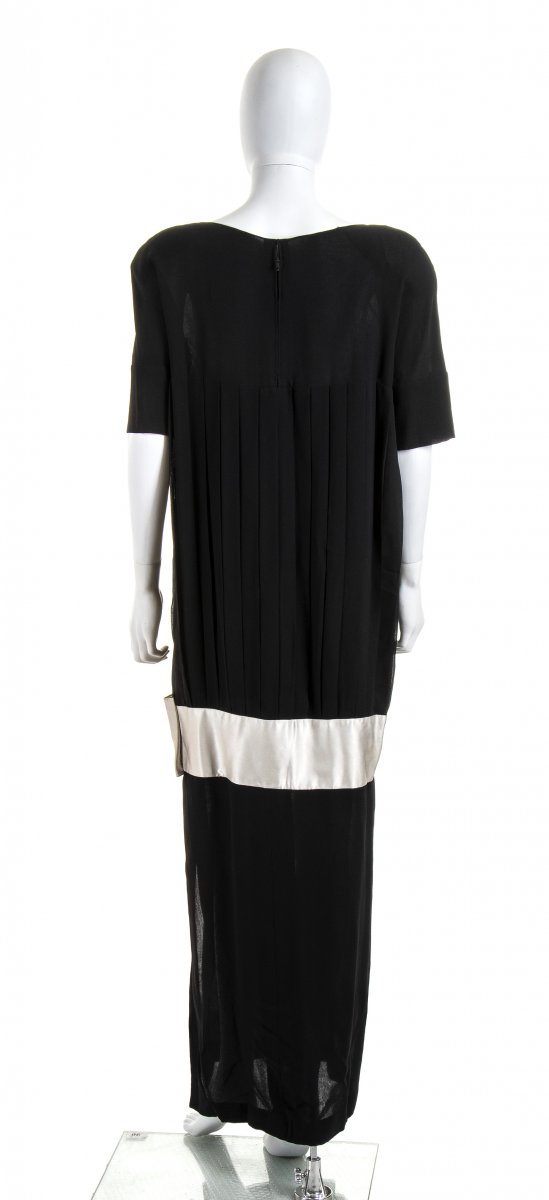 Fine anni ‘80 / Inizio anni ‘90 Abito da sera in crepe di seta nero, fascia e fiocco in raso bianco, dettaglio del fiocco in strass
