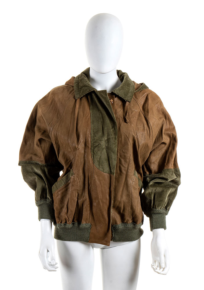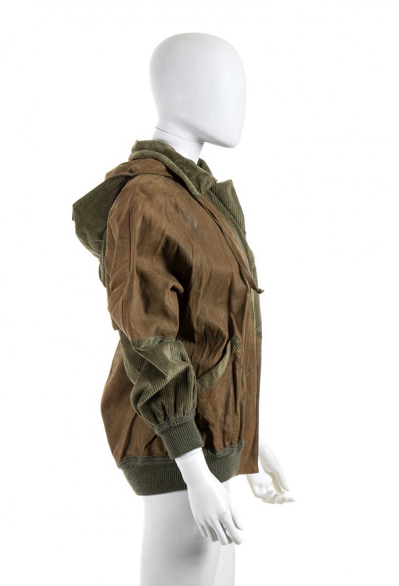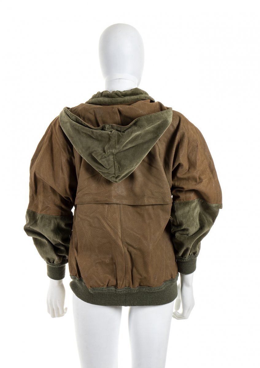 Inizio anni ‘80 Giubbotto in pelle marrone e dettagli in velluto a coste verde, con cappuccio