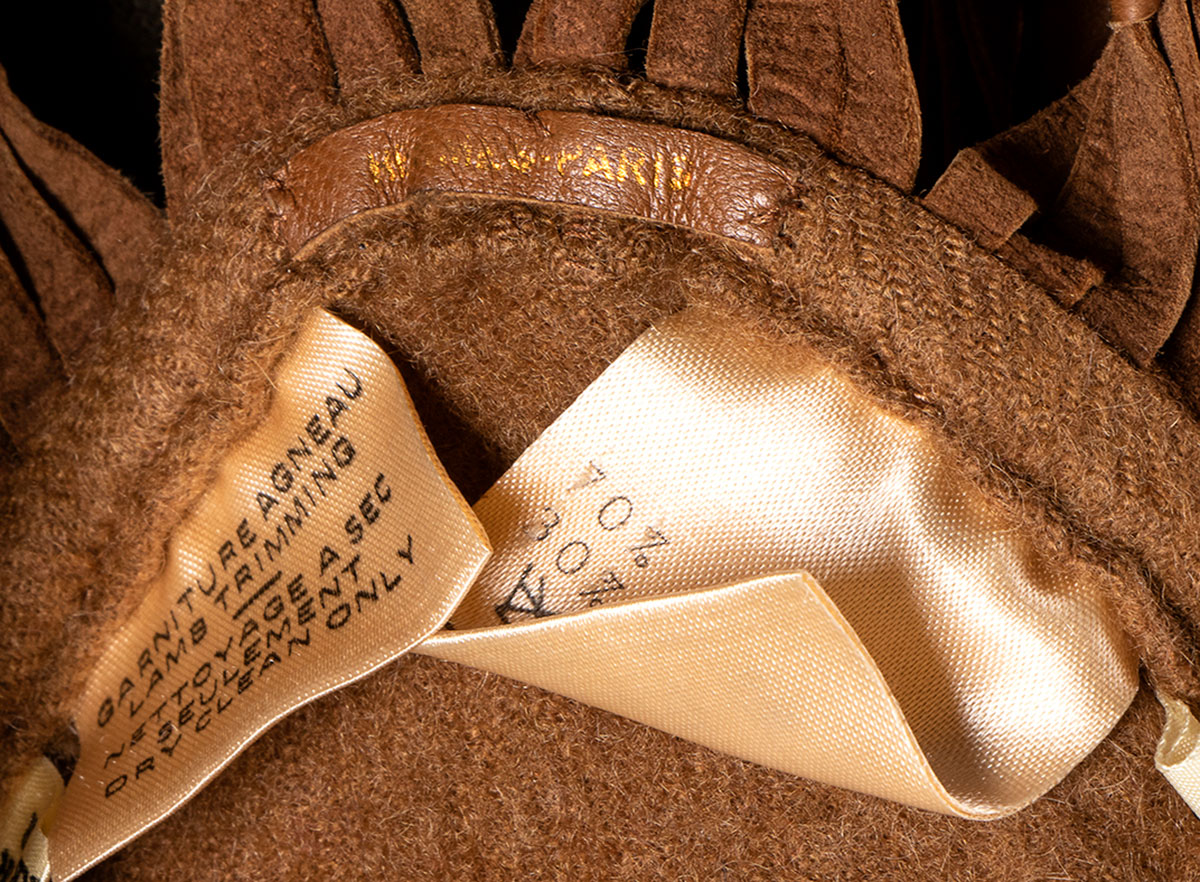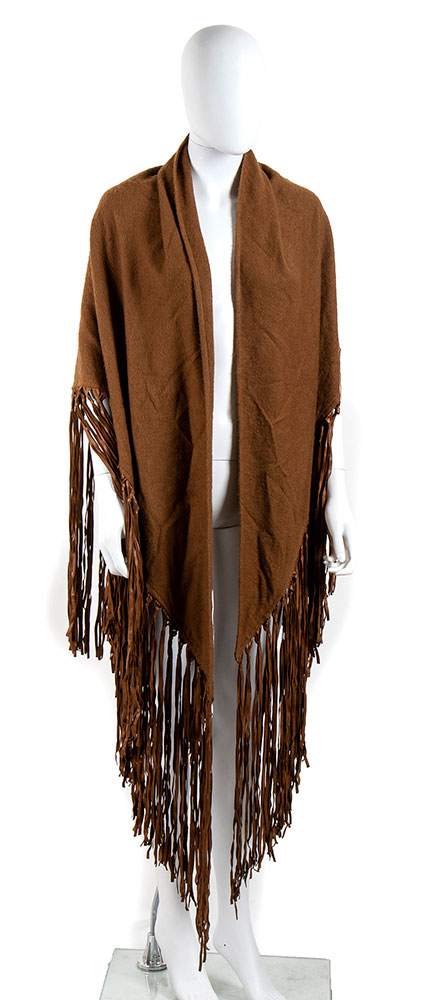 Anni ‘80 Grande scialle in lana e cashmere color cammello, lunghe frange in pelle marrone,