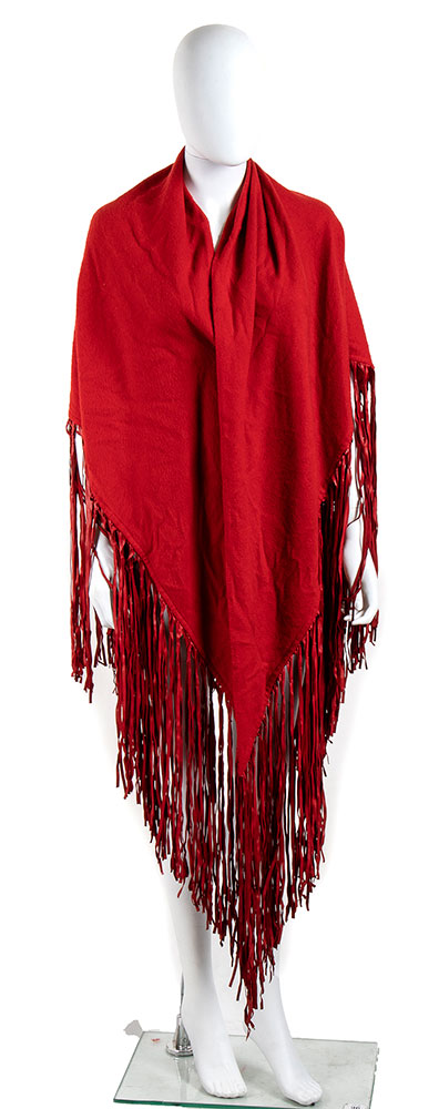 80s Grande scialle in lana e cashmere colore rosso lunghe frange in pelle rossa