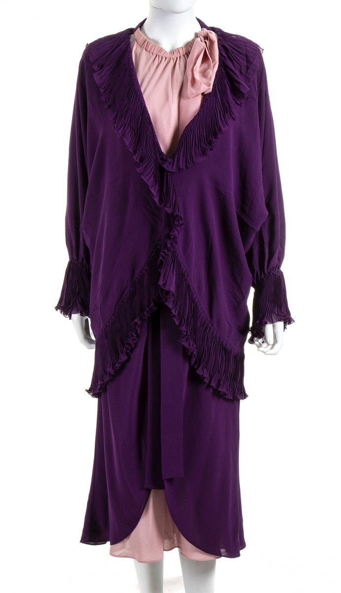 1981 ca Abito e giacchino in crepe di seta viola e rosa, scarpe Sacchetti in seta viola e perline, cappello con veletta Cleo Romagnoli in seta viola,