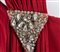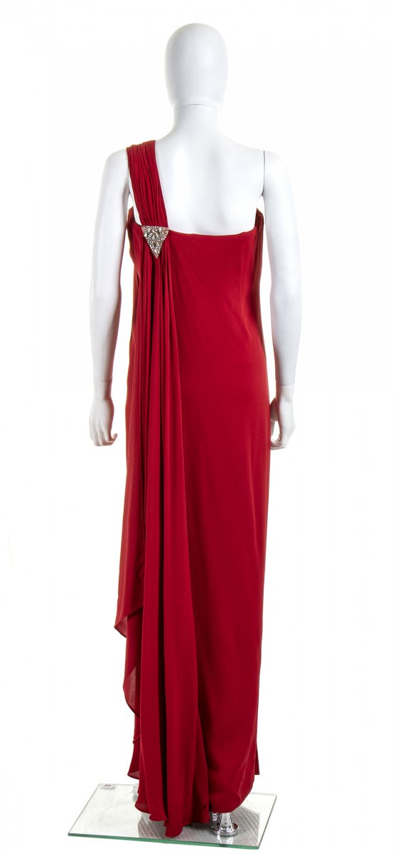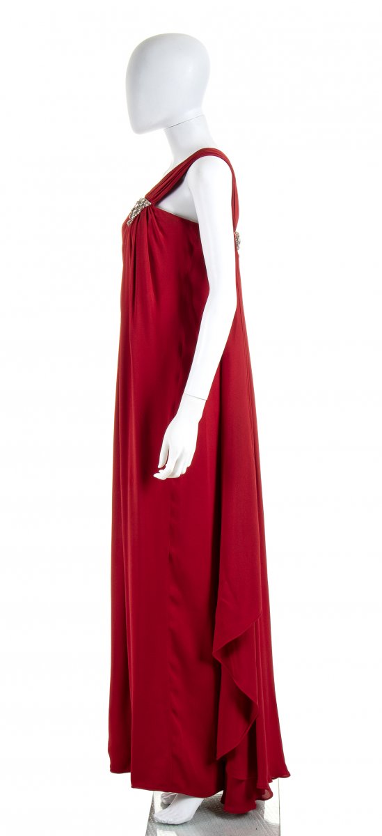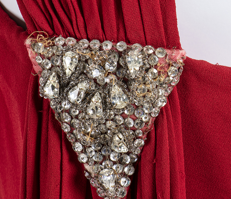 Primavera/Estate 1984 Abito da sera in crepe di seta rosso, dettaglio ricamato con strass e perline