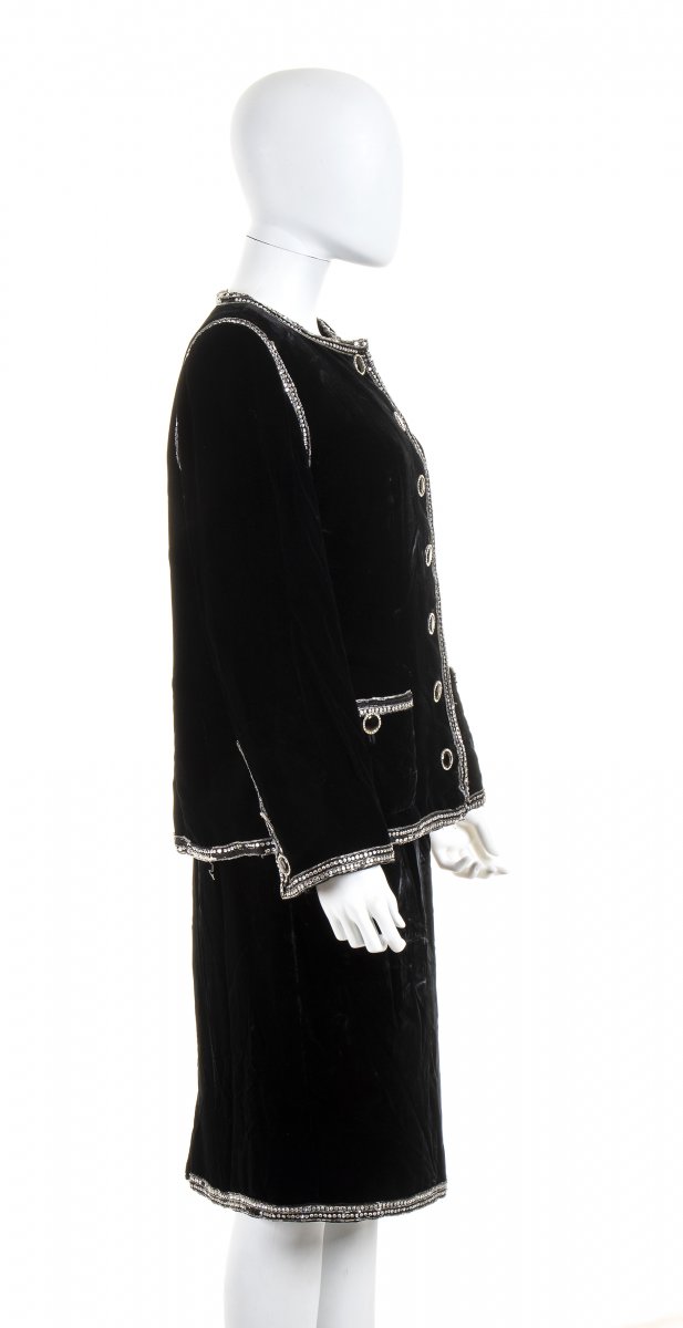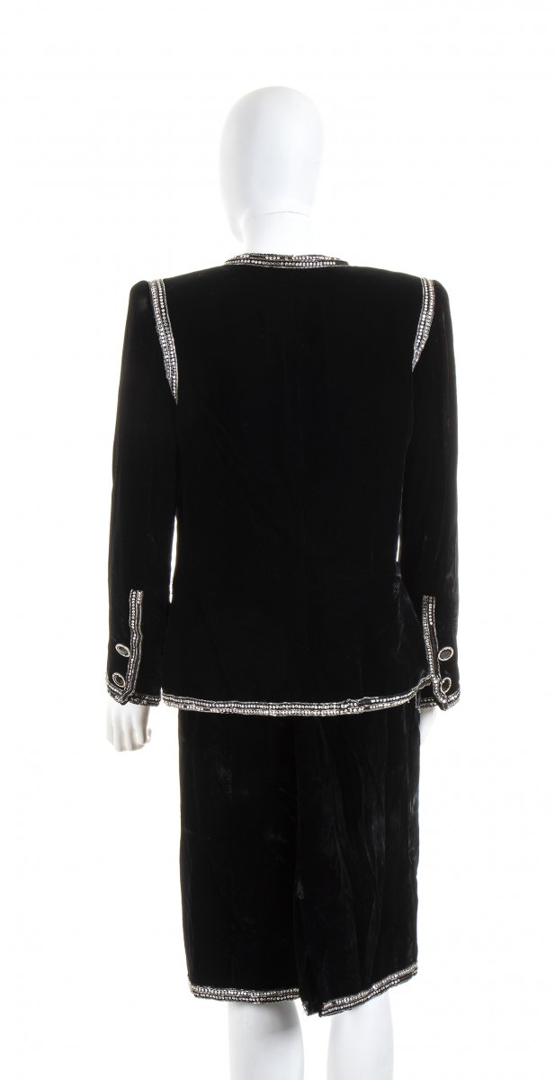 Anni ‘90 Completo (gonna e giacca) in velluto nero profili ricamati con perline e strass