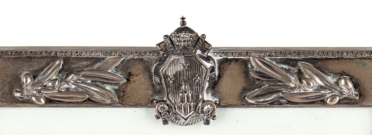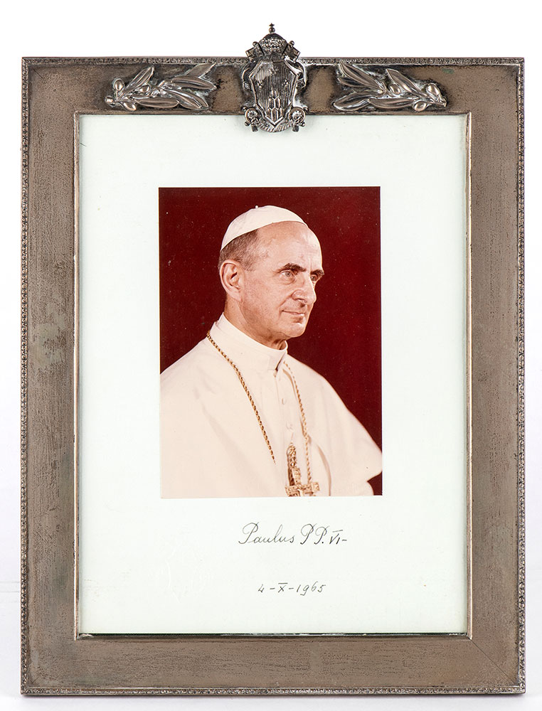 Papa PAOLO VI - Giovanni Battista Enrico Antonio Maria Montini (Concesio, 26 settembre 1897 – Castel Gandolfo, 6 agosto 1978) Foto a colori con timbro a secco della segreteria del Vaticano, con firma autografa ad inchiostro blu di Papa Paolo VI, PAULUS PP.VI, datata 4-X-1965. In splendida cornice in argento recante cimasa a stemma nobiliare Montini con rami di ulivo
