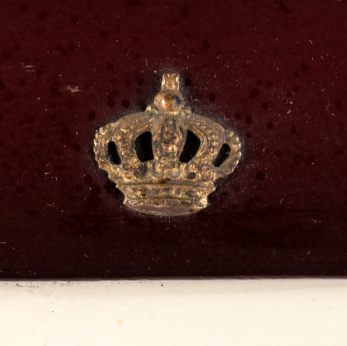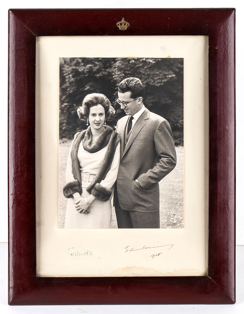 BALDOVINO e FABIOLA, regnanti Belgio - Baudouin Albert Charles Léopold Axel Marie Gustave (Laeken, 7 settembre 1930 – Motril, 31 luglio 1993) ; Doña Fabiola Fernanda María de las Victorias Antonia Adelaida de Mora y Aragón (Madrid, 11 giugno 1928 – Laeken, 5 dicembre 2014) Regnanti del Belgio, re Baldovino e regina Fabiola, foto b/n, in abiti civili, con firme autografe ad inchiostro blu e nero, datata 1966. In cornice rivestita di similpelle bordeaux, con corona reale in metallo argentato, applicata in alto