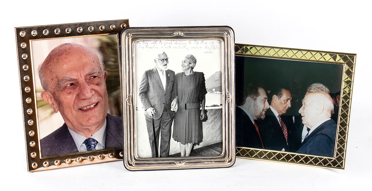 FANFANI, Amintore e Maria Pia Lotto di 3 foto a colori e b/n, Maria Pia Fanfani ed Amintore Fanfani con altri personaggi, una con dedica e firma autografa, in cornici d'argento e non