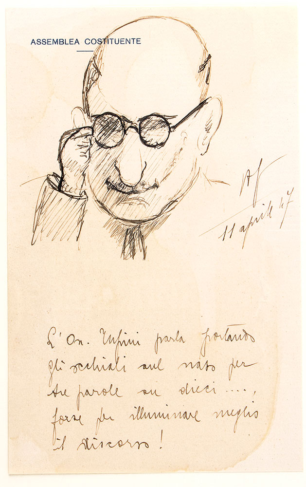 FANFANI, Amintore - Vignette e disegni - anni '40 - (Pieve Santo Stefano, 6 febbraio 1908 – Roma, 20 novembre 1999) Vignetta dal titolo "L'onorevole Tupini parla portando gli occhiali sul naso per tre parole su dieci ... Forse per illuminare meglio il discorso", firmata, 11 Aprile 1947. Su carta intestata Assemblea Costituente