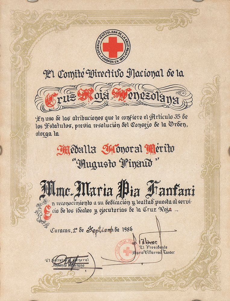 Riconoscimenti vari, Venezuela Attestato di Medaglia d'Onore al Merito "Augusto Pinaud" della Croce Rossa Venezuelana - Cruz Roja Venezolana - assegnata a Maria Pia Fanfani a Caracas 1 Settembre 1986