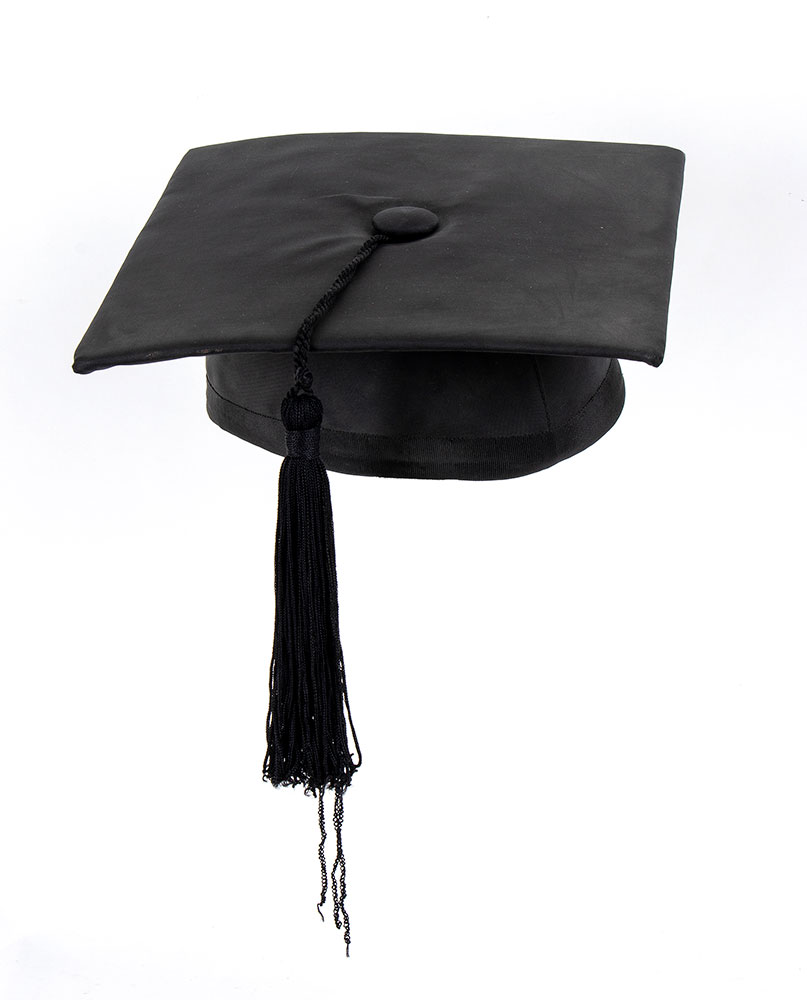 Tocco per Laureando In stoffa nera, con cappio discendente e fiocco, per laurea ad honorem, di Amintore Fanfani, marca canadese