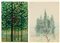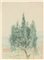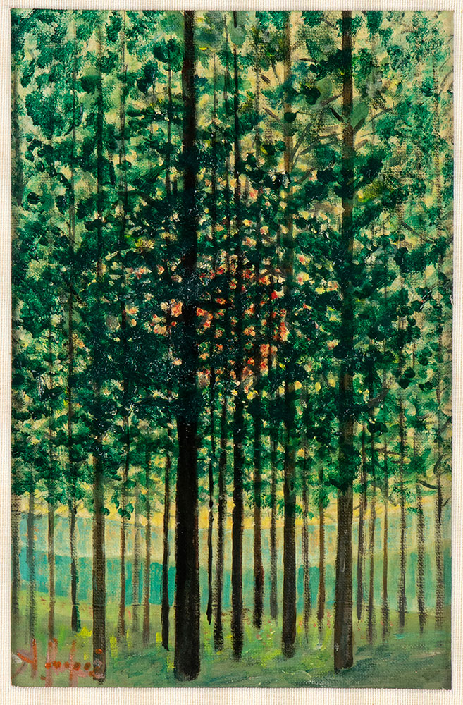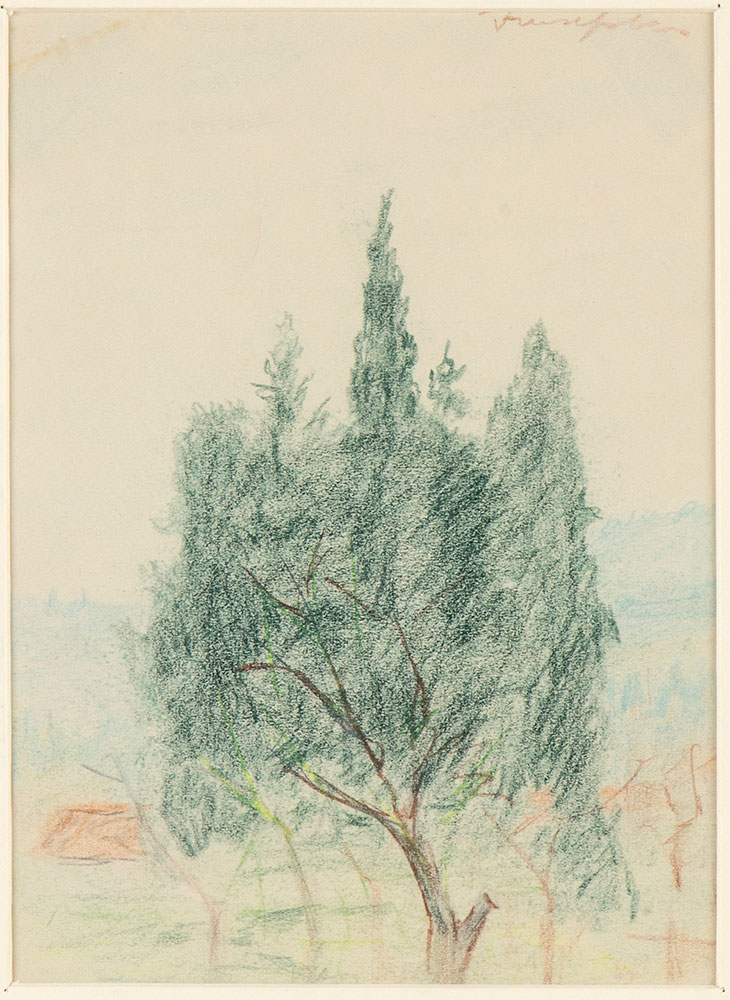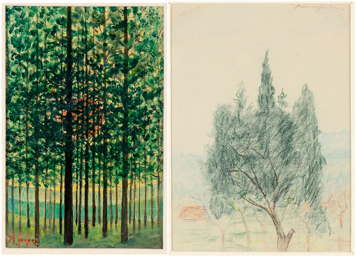 FANFANI, Amintore (Pieve Santo Stefano, 6 febbraio 1908 – Roma, 20 novembre 1999) Lotto di due composizioni originali firmate Amintore Fanfani "Tramonto dietro agli alberi" 1988 olio su cartoncino telato, "Alberi" Sansepolcro (?) matita su carta 1944 . In cornice